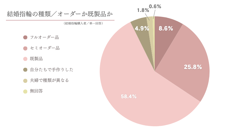 フルオーダーとセミオーダーを合わせると、全体の34.4%、およそ3人に1人がオーダーメイドの結婚指輪を選んでいる計算です。