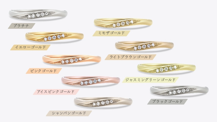 素材の選択肢も豊富で、プラチナは2種類、ゴールドはシャンパンゴールドやミモザゴールドなど珍しいカラーを含む8種類から選択可能。