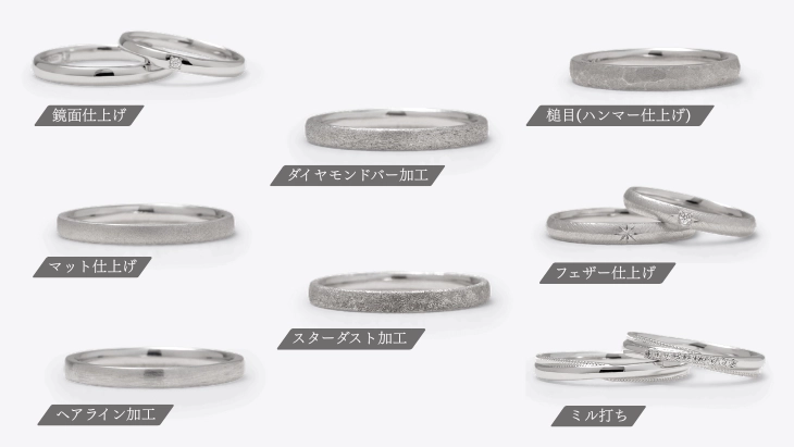 1000点以上の婚約指輪・結婚指輪のラインナップをご用意しており、この豊富なラインナップに、リングの素材や表面仕上げの変更、ダイヤモンドの変更などお好みのアレンジオーダーが可能です。