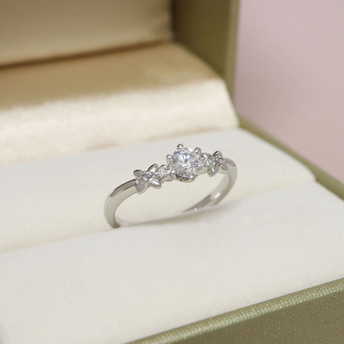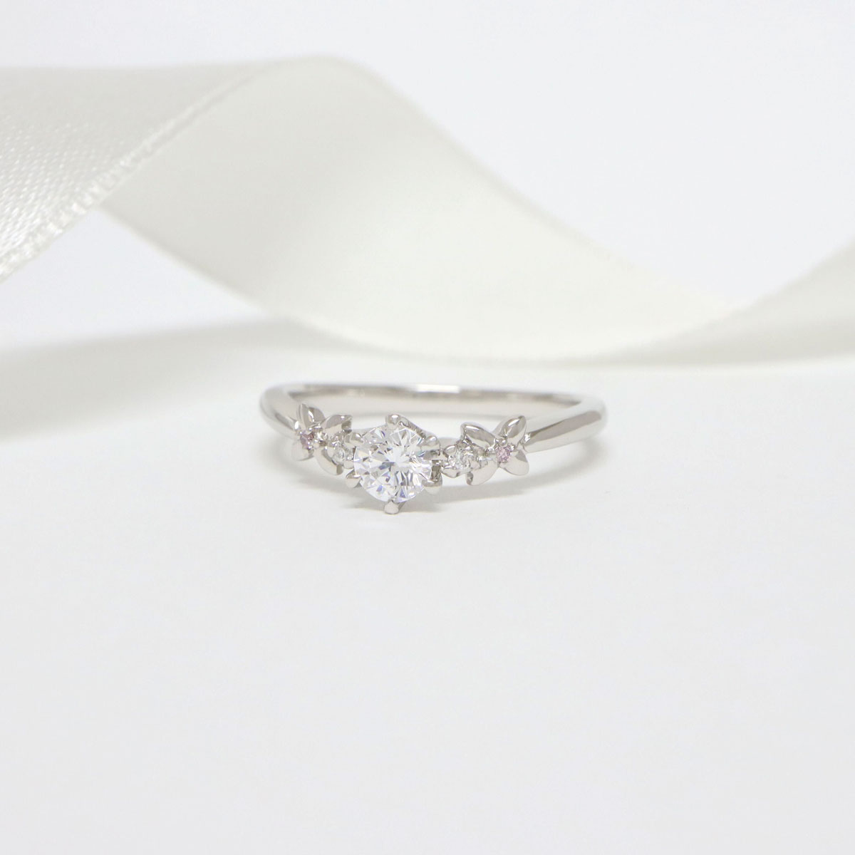 リングのアーム部分にお花のデザインが広がる婚約指輪。