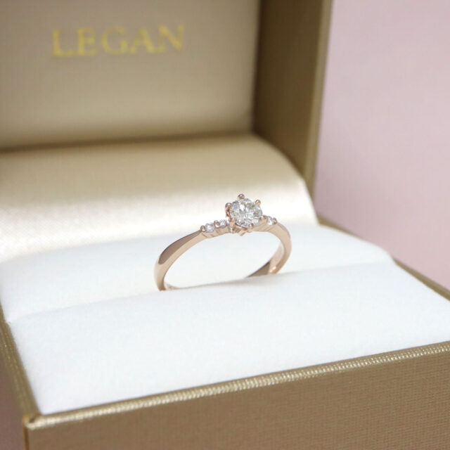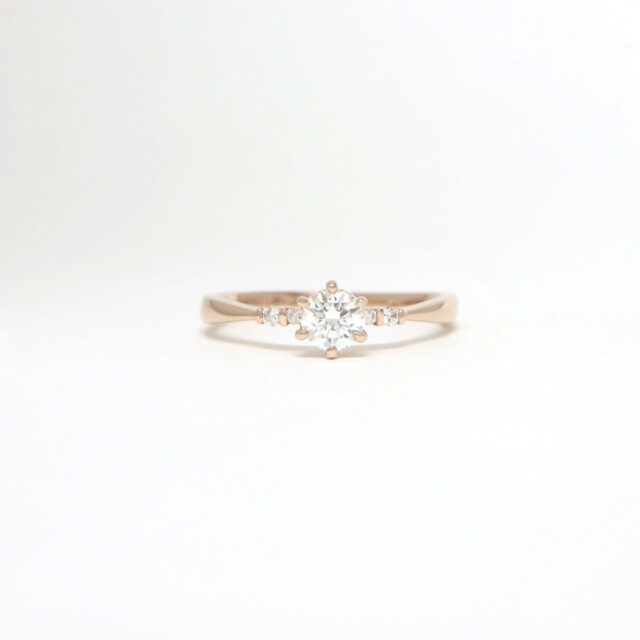 両サイドに二粒ずつ付いたメレダイヤが可愛らしく、センターダイヤモンドの輝きをより一層引き立てます。さりげなく指先が華やぐリングです。