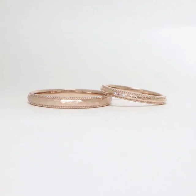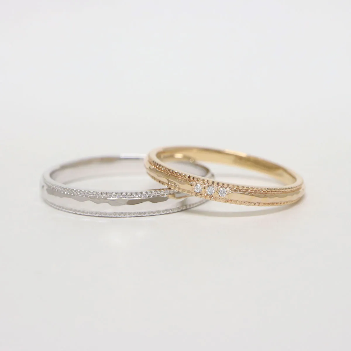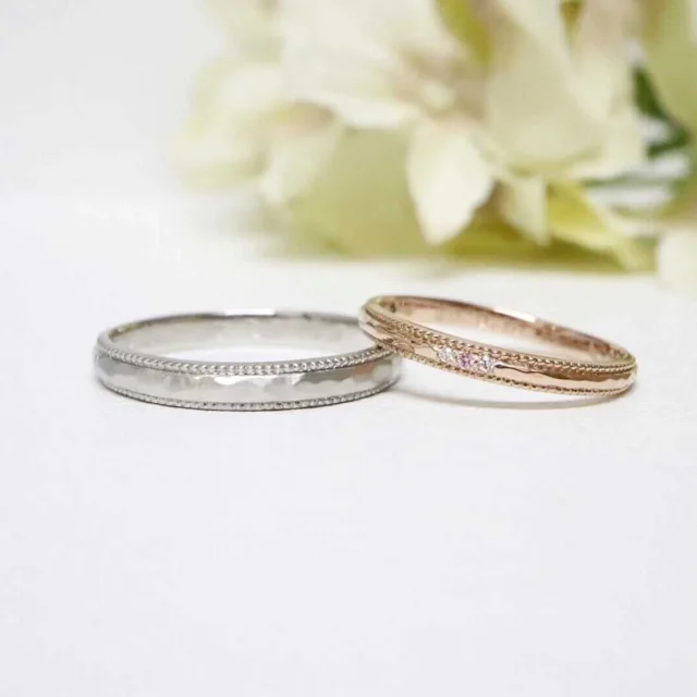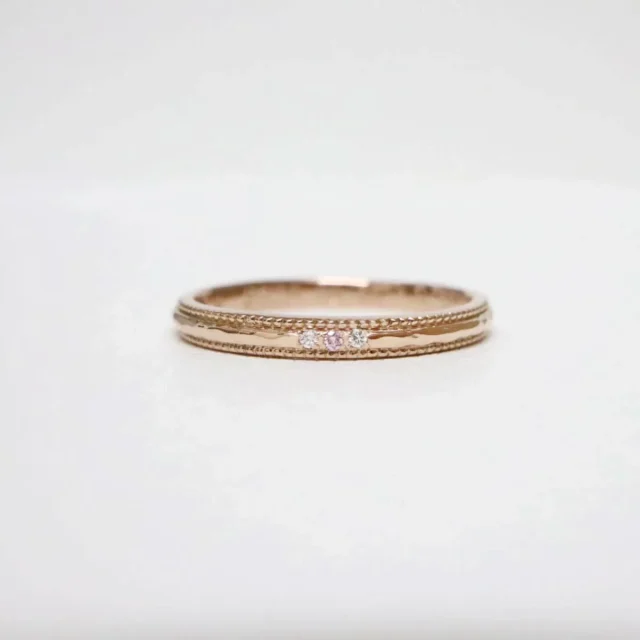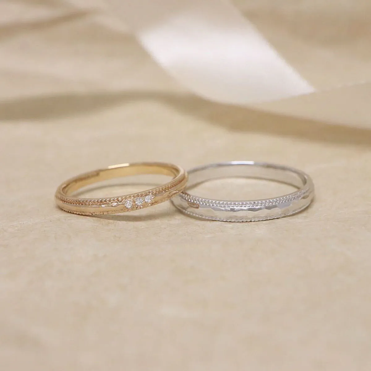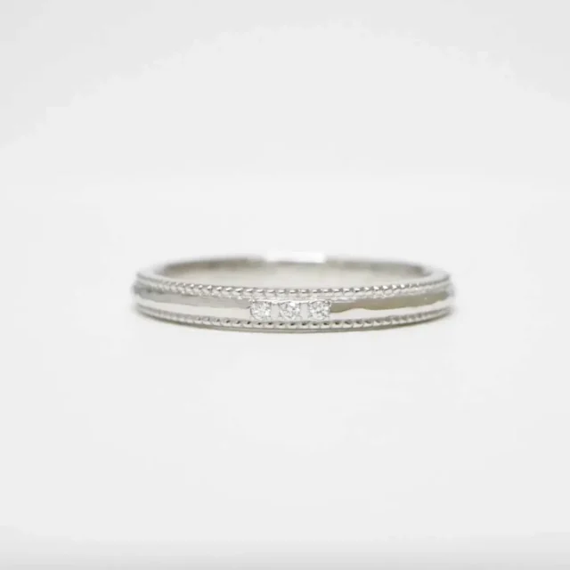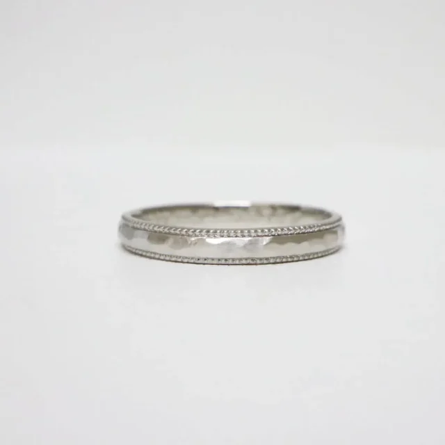 華奢で立体的なフォルムとサイドの均一なミルグレインが美しいリング。表面に凹凸をつけた槌目加工でアンティーク調に仕上げました。