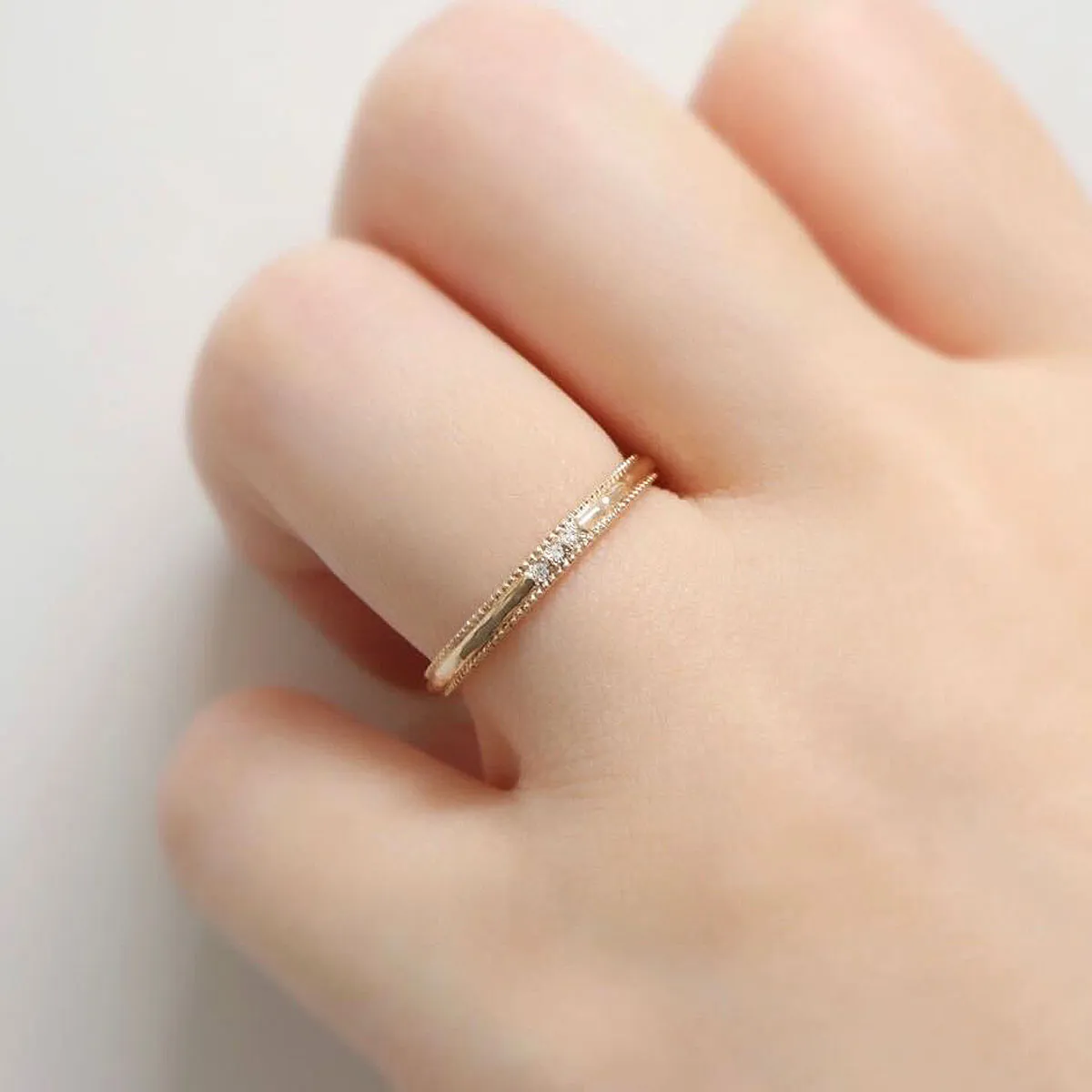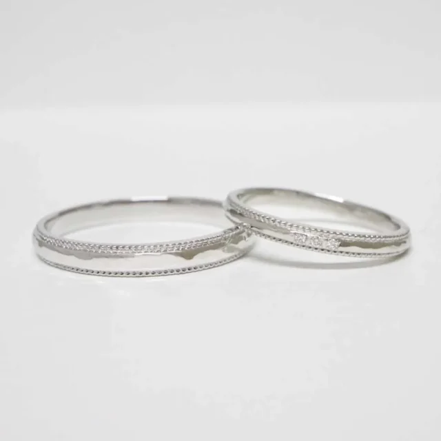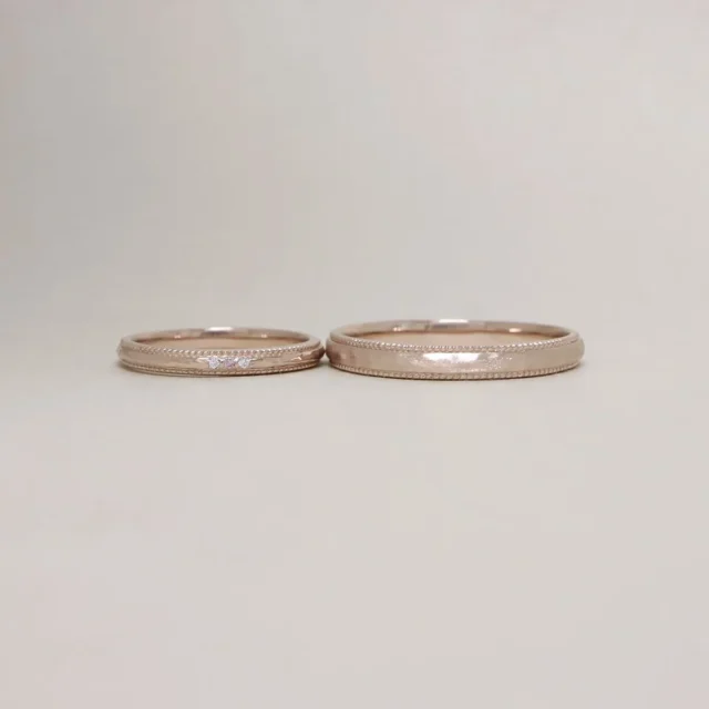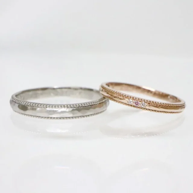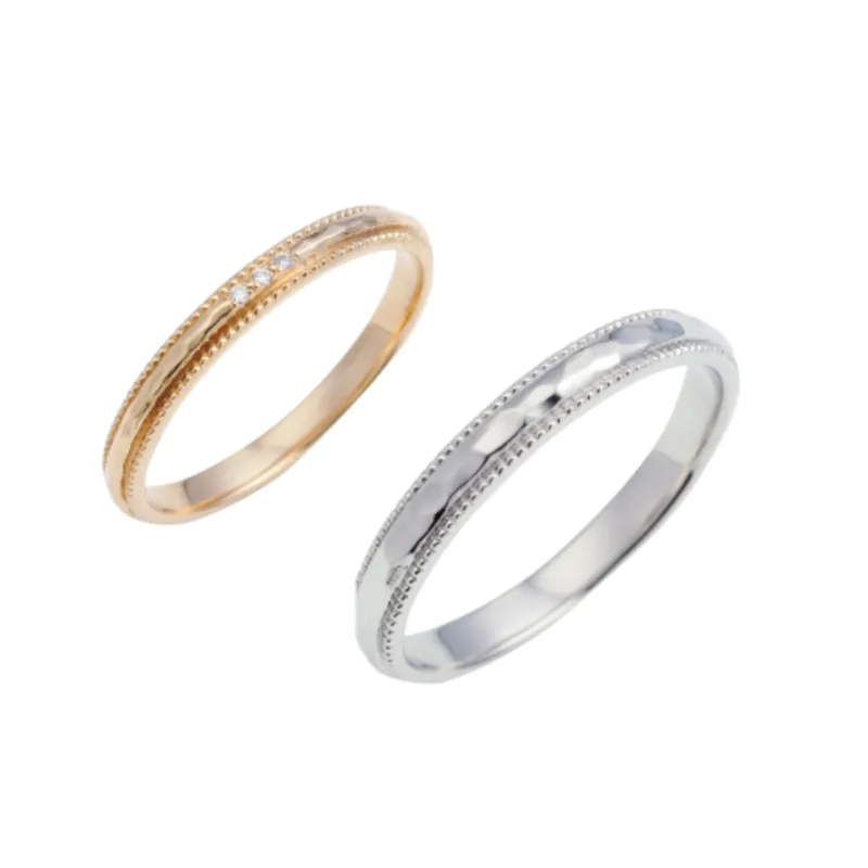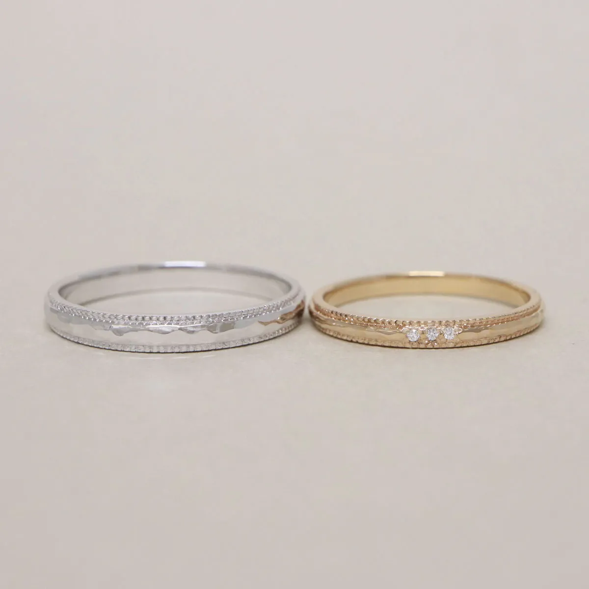 華奢で立体的なフォルムとサイドの均一なミルグレインが美しいリング。表面に凹凸をつけた槌目加工でアンティーク調に仕上げました。