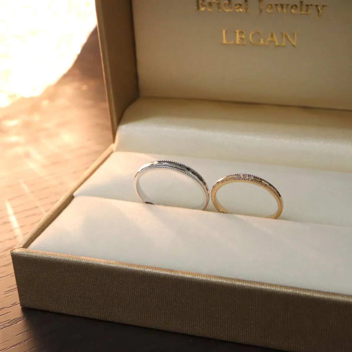 自由なアレンジができるLEGANの結婚指輪。LEGANは日本有数の老舗ブライダルジュエリー工房へ直接オーダーを行い、高品質なブライダルリングを適正価格でご提供しています。デザインは数百を超える豊富なラインナップをご用意し、コンシェルジュと相談をしながら高い技術を有するアトリエだからこそ実現できる様々なアレンジで、おふたりの理想のリングをご提供しております。