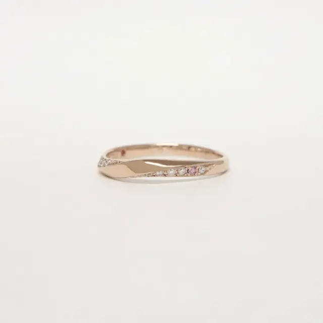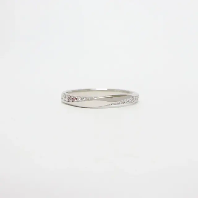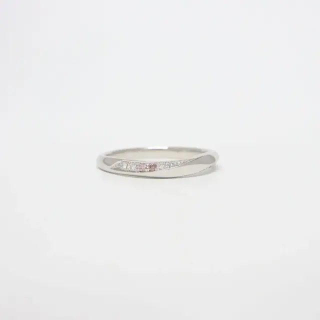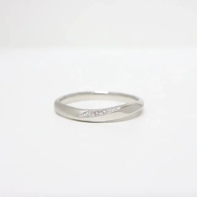 リングの両サイドにメレダイヤモンドを流れるようにセッティング。プラチナの素材感を引き立てつつ、手元を動かす度にダイヤモンドが上品に煌めきます。
