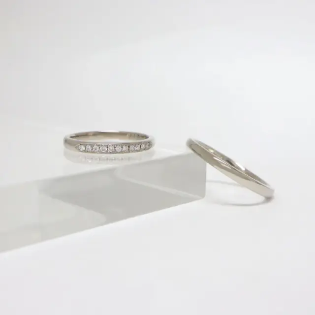〜 甘く幸せに満ちた日々に 〜という願いを込めた結婚指輪。職人が丁寧に1石ずつセッティングした連なったダイヤモンドが優美で美しく輝きます。