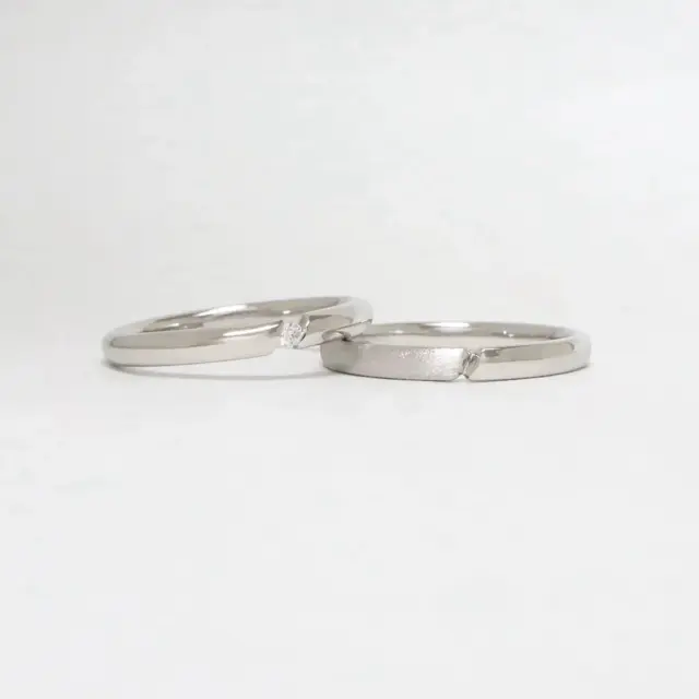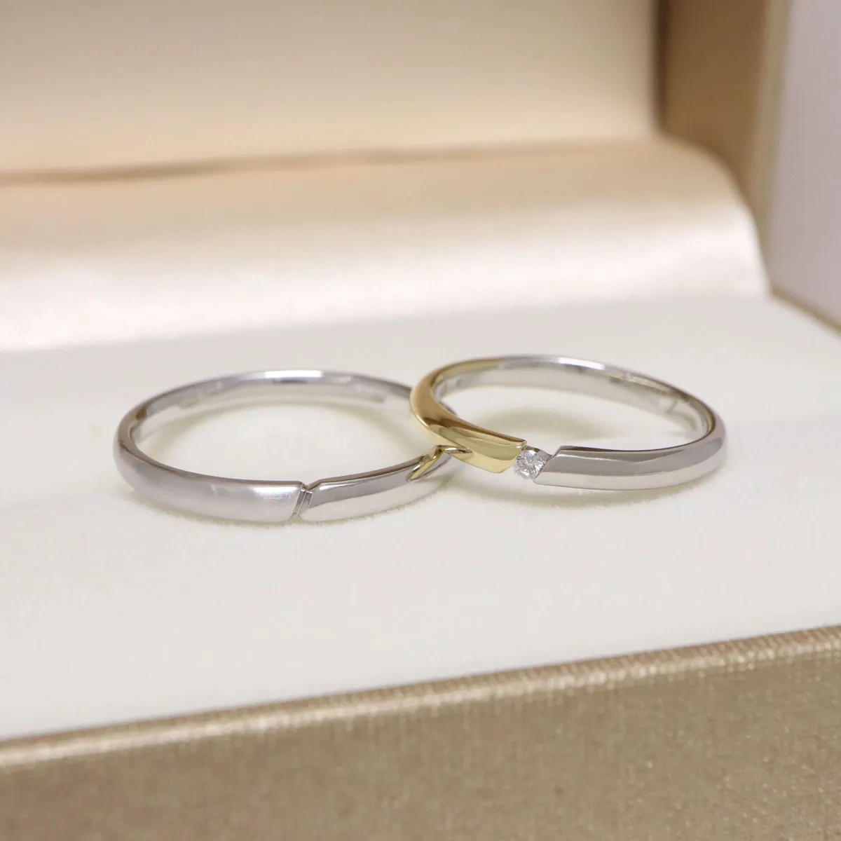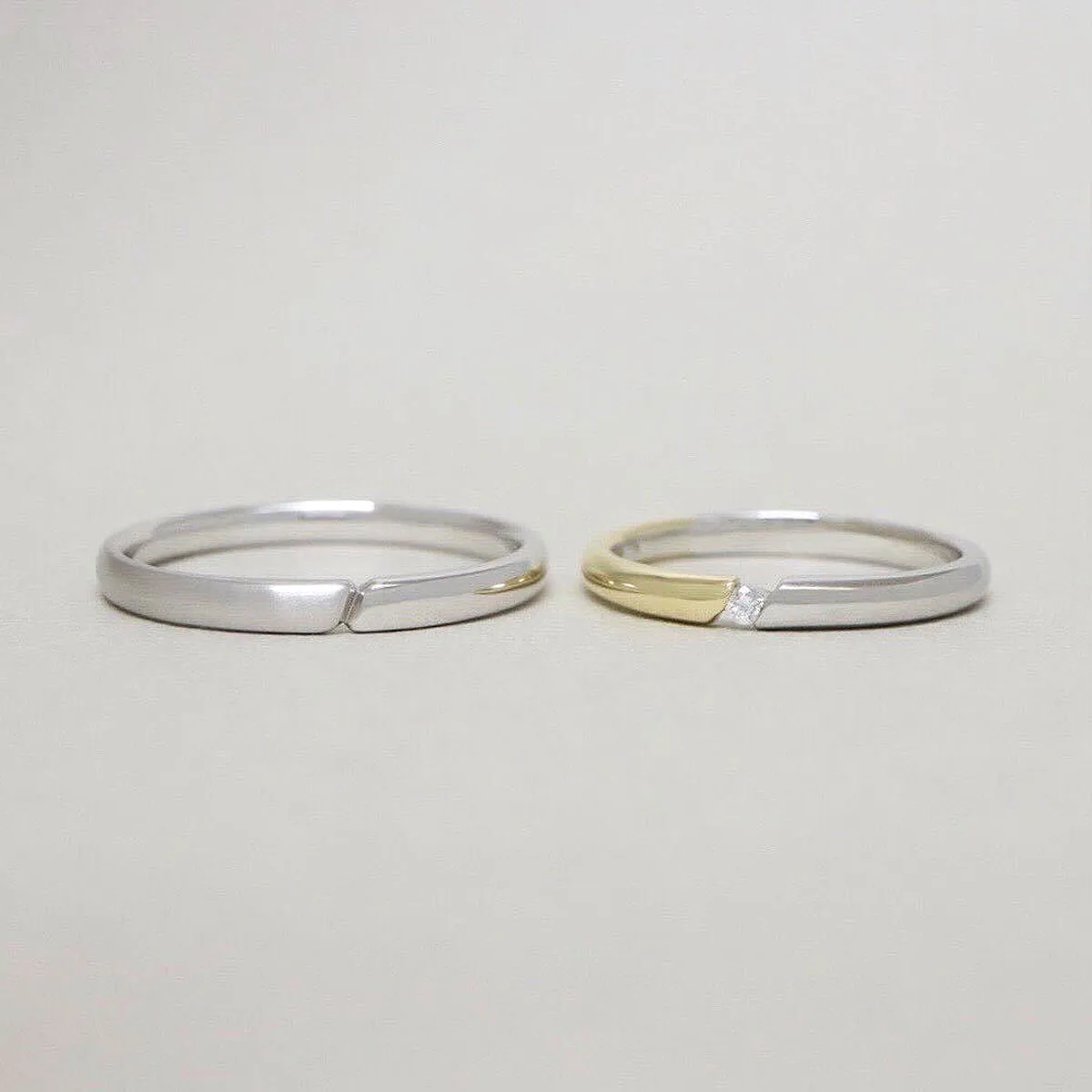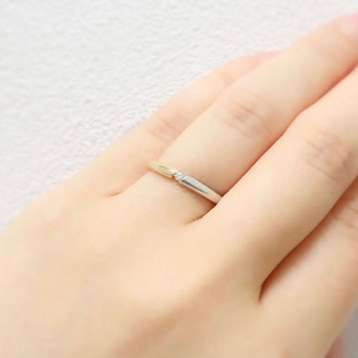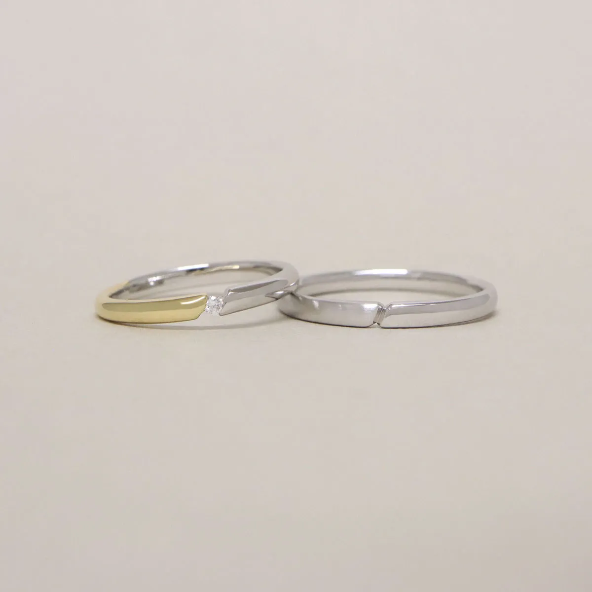 プラチナとイエローゴールドは出会うべくして出会った運命の道のりをイメージ。1石のダイヤモンドはふたりの絆の象徴。