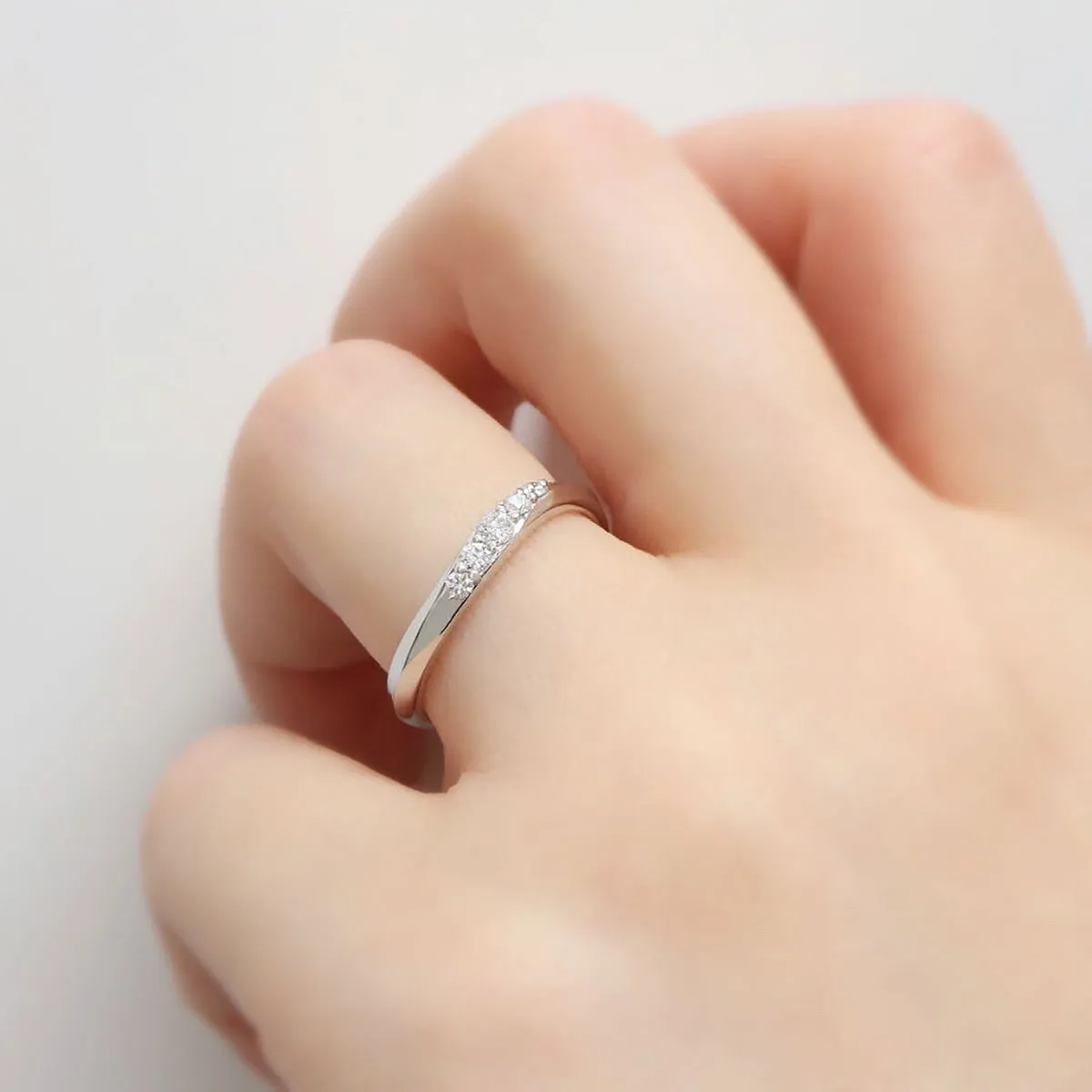 名前に由来したサイズの異なるメレダイヤモンドやラインの動きがさまざまな表情を映し出すデザイン。 指から流れる様なラインと大粒のダイヤモンドたち、つい指元を動かしたくなるような華やかさで魅了します。