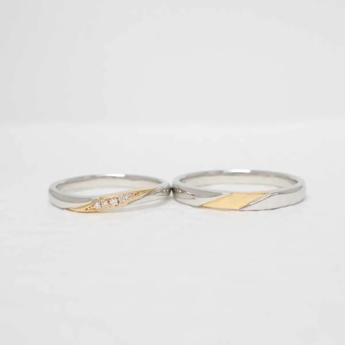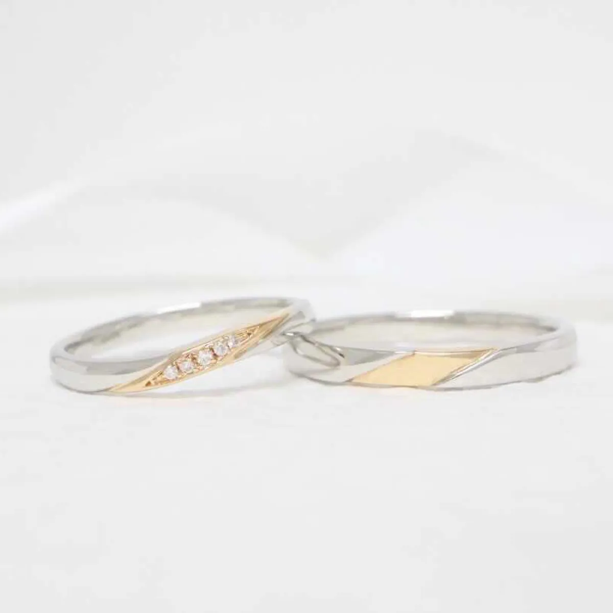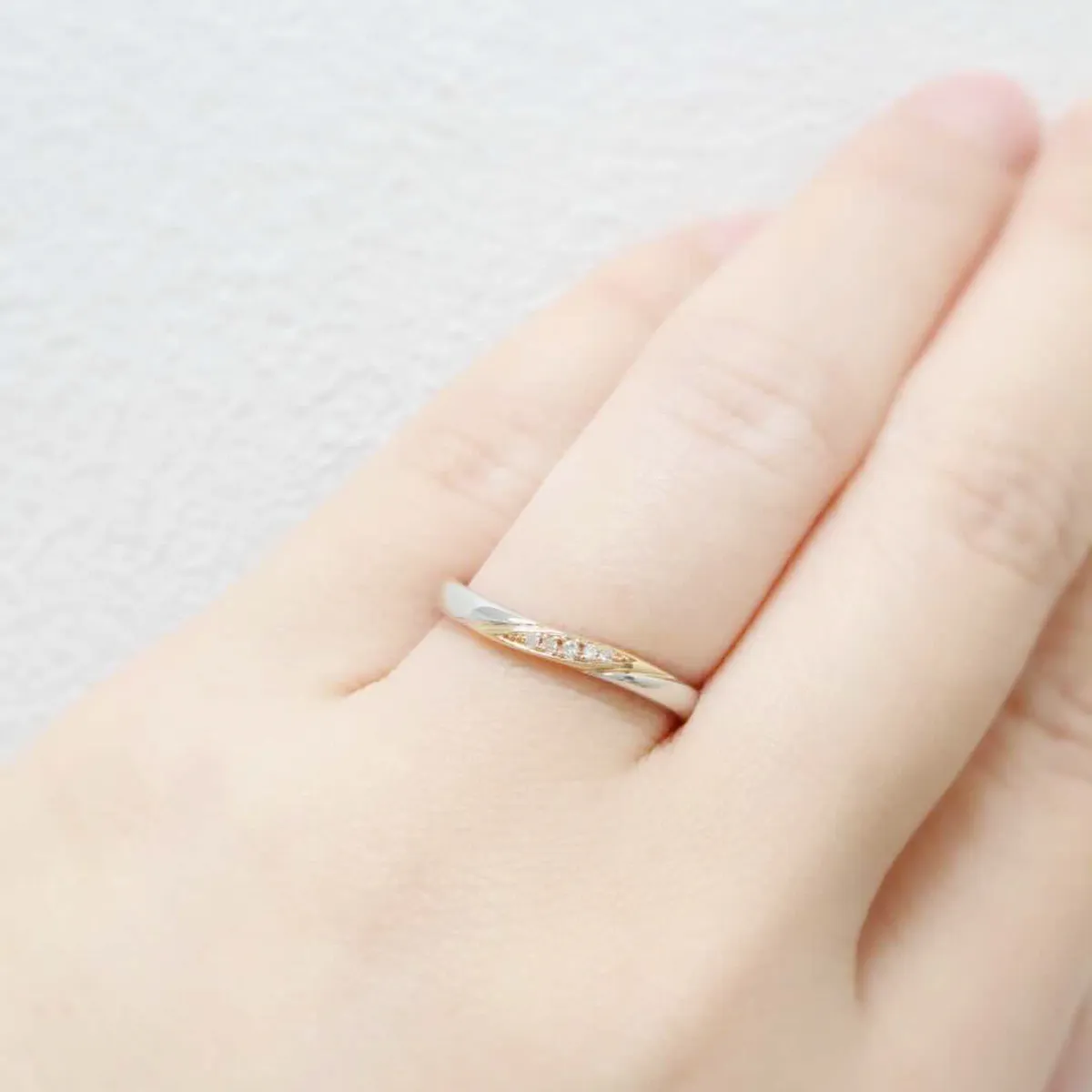 プラチナとピンクゴールドが織りなすコンビリング。ピンクゴールド部分へダイヤモンドをセッティングし、華やかでありながら優しい雰囲気を醸し出します。