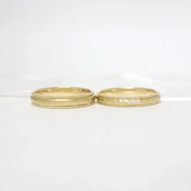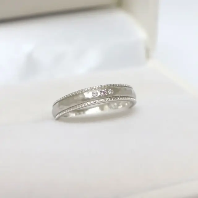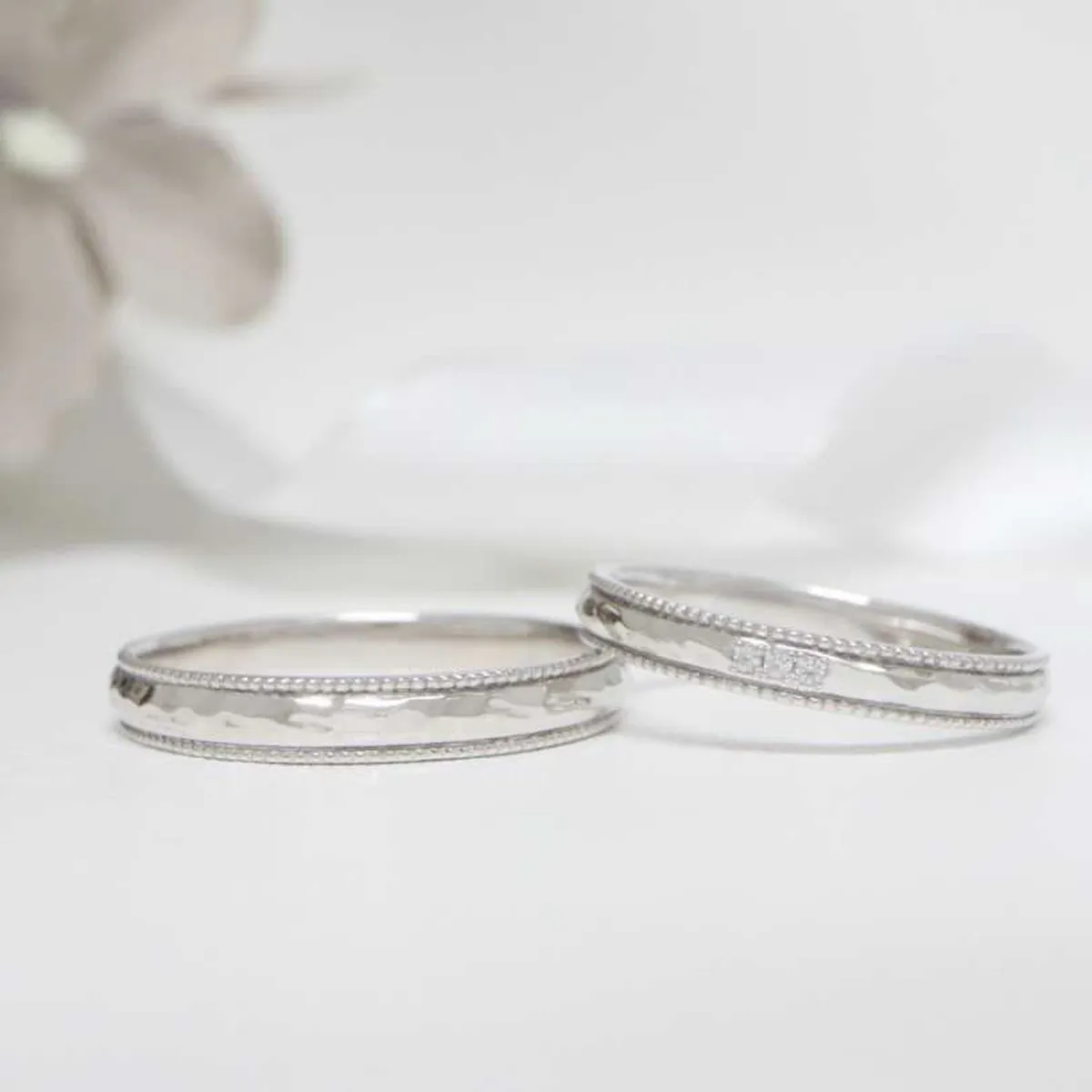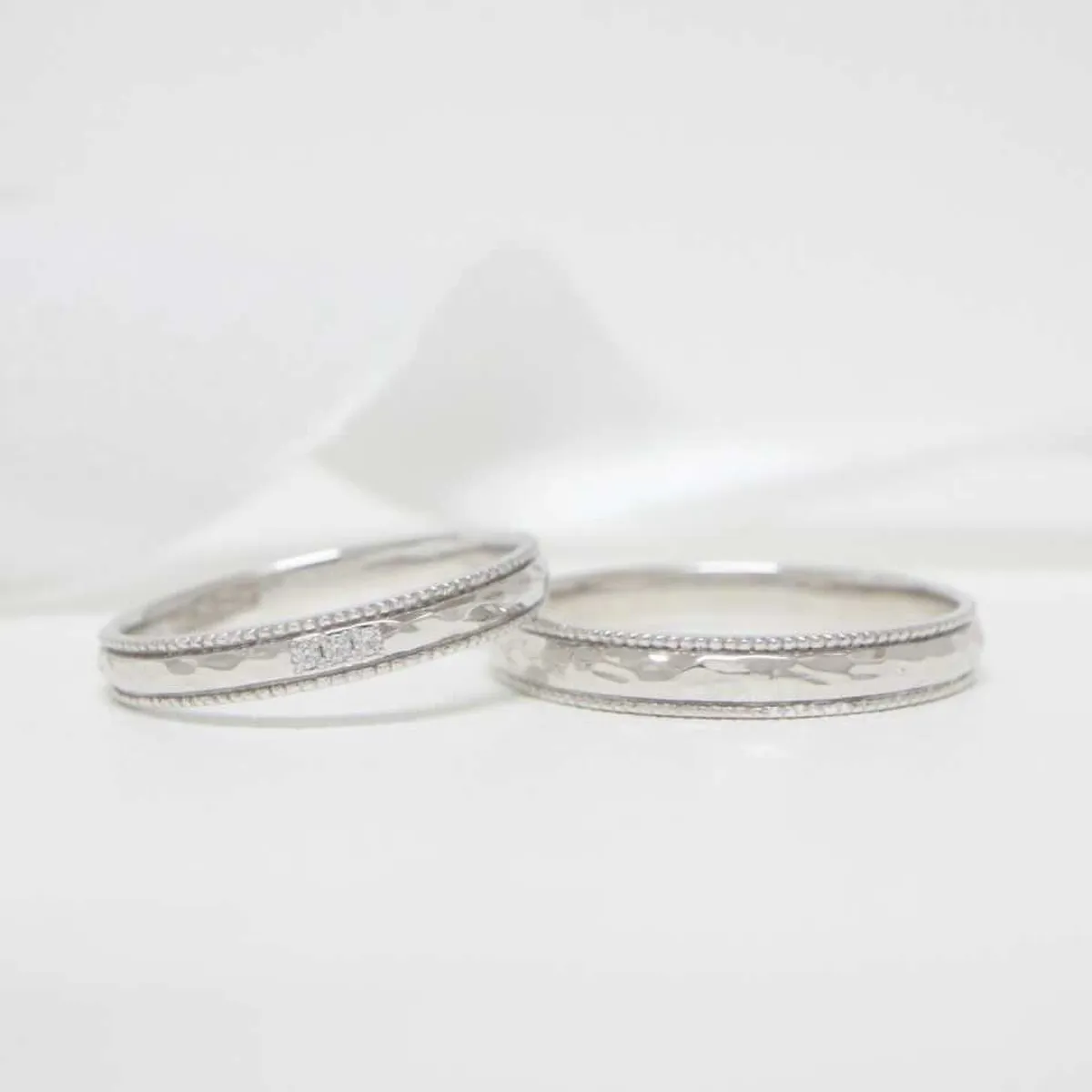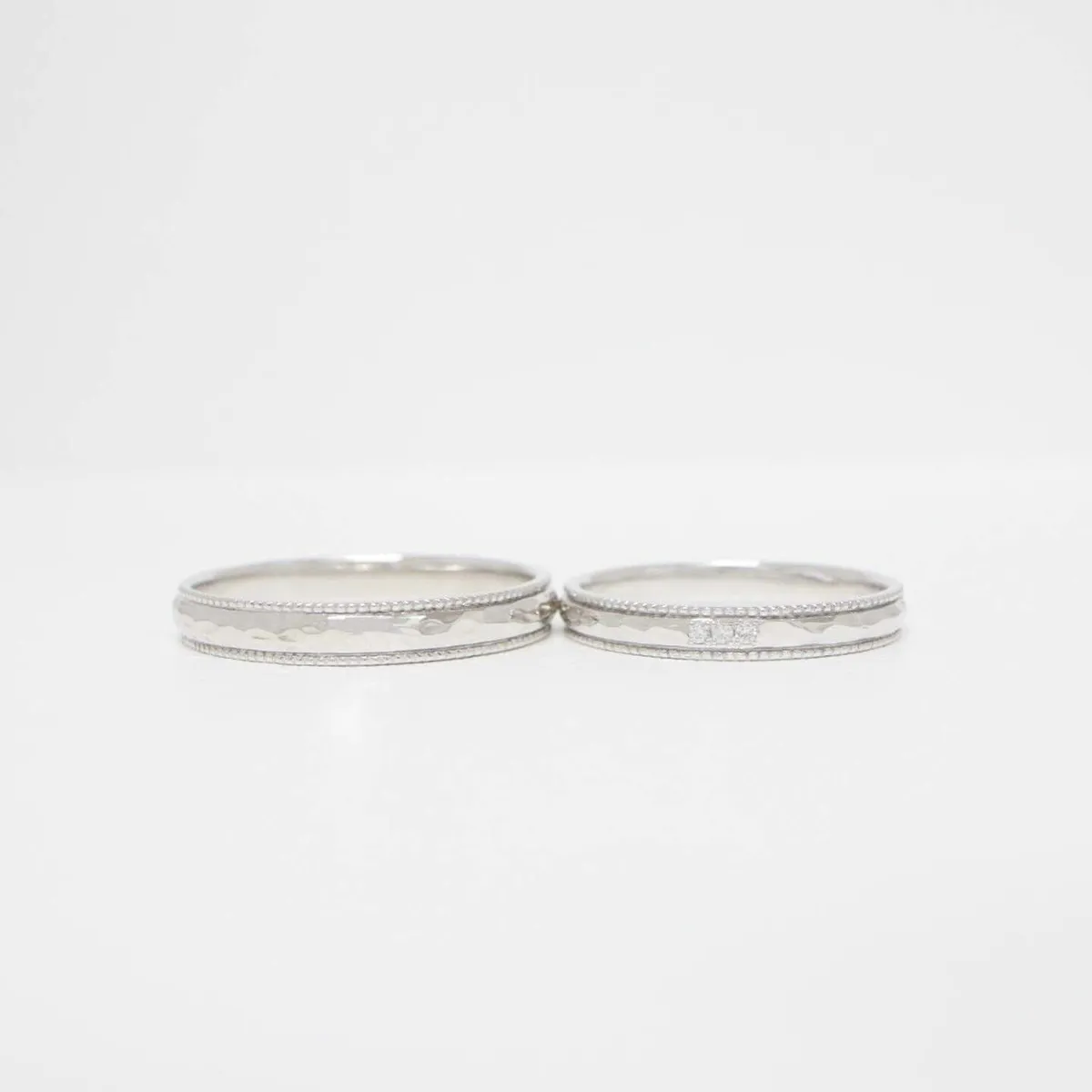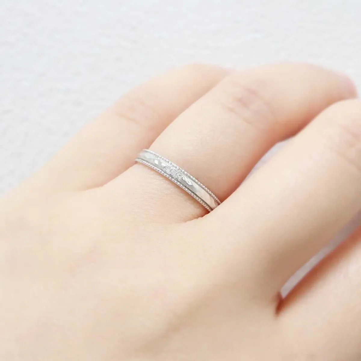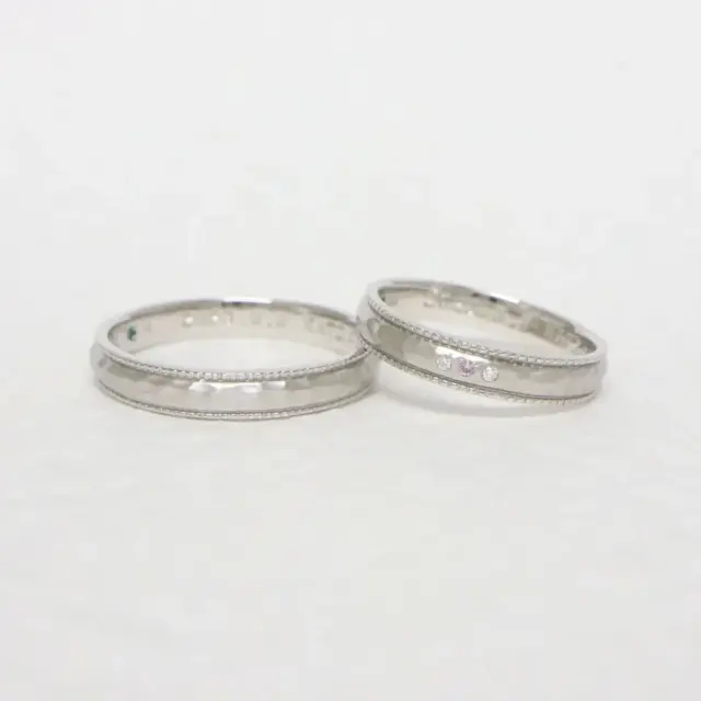 ハンマー仕上げ風のテクスチャーとミルグレインがサイドに施された特別感のあるデザイン。プラチナの素材感が引き立ちます。