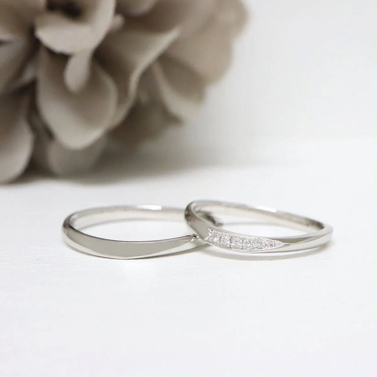 いつまでもお互いを想い合えるように。すっきりとしたシルエットにエッジの効いたデザインはダイヤモンドがより輝くようにダイヤの留め方にもこだわりました。