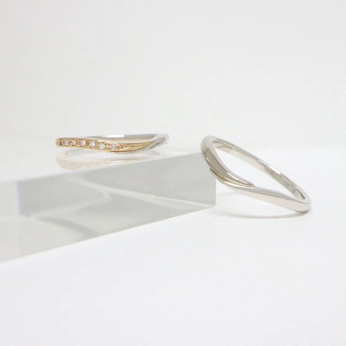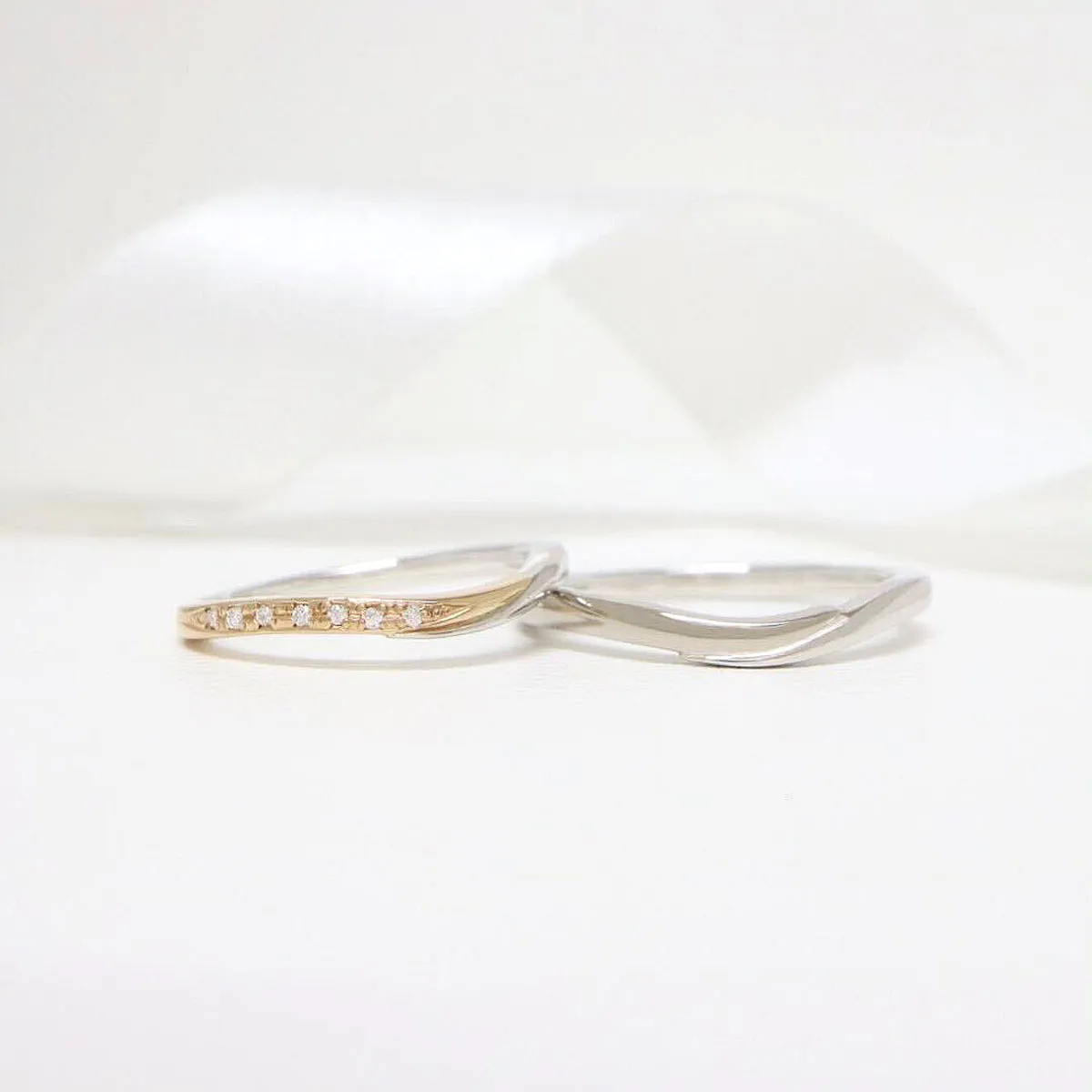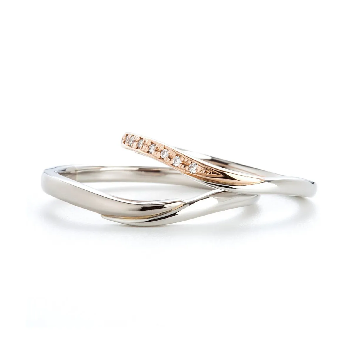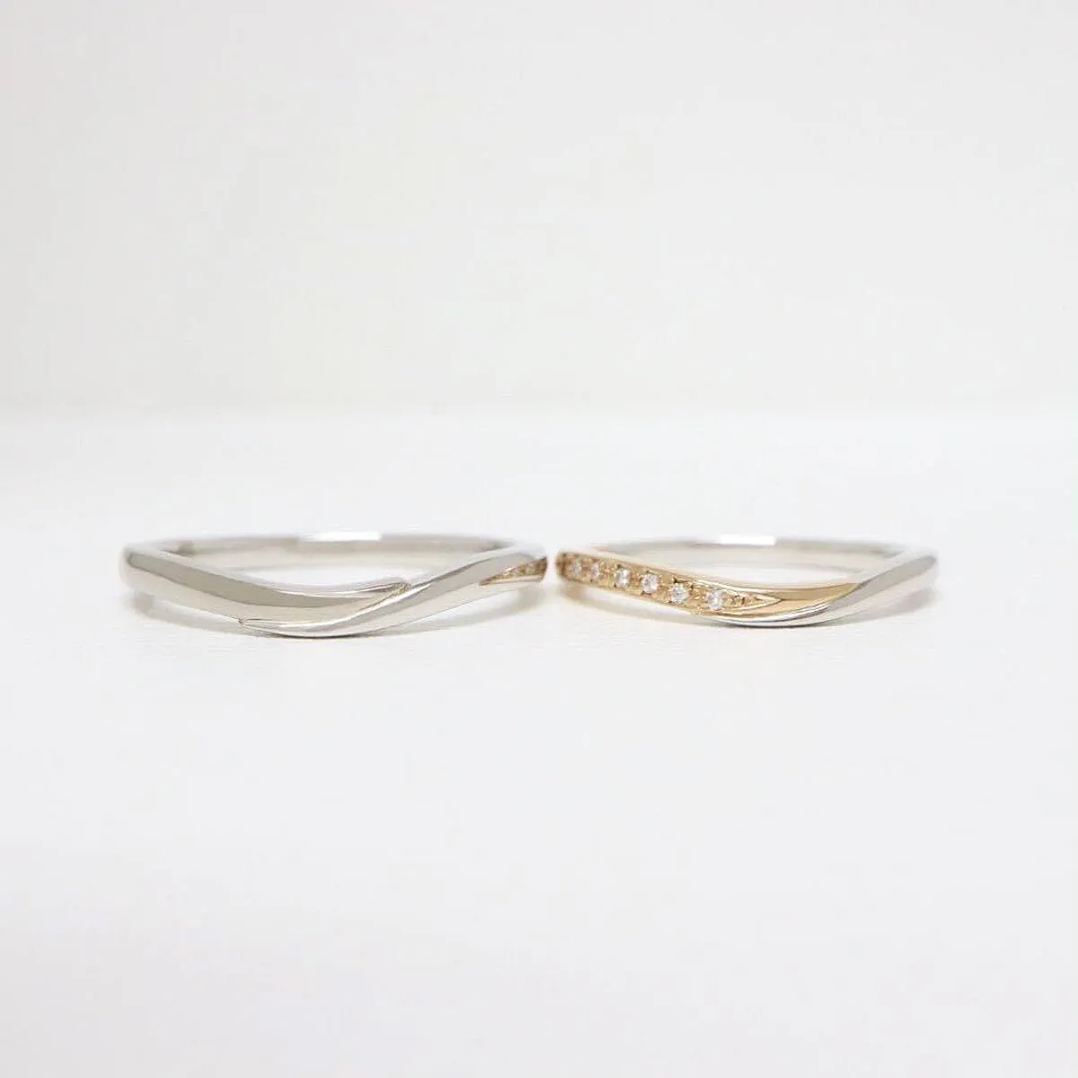 ふたりの想いが重なったようなプラチナとゴールドのシンメトリーが美しい結婚指輪。それは決して離れない絆。緩やかなカーブはそれぞれの素材を引き立てます。