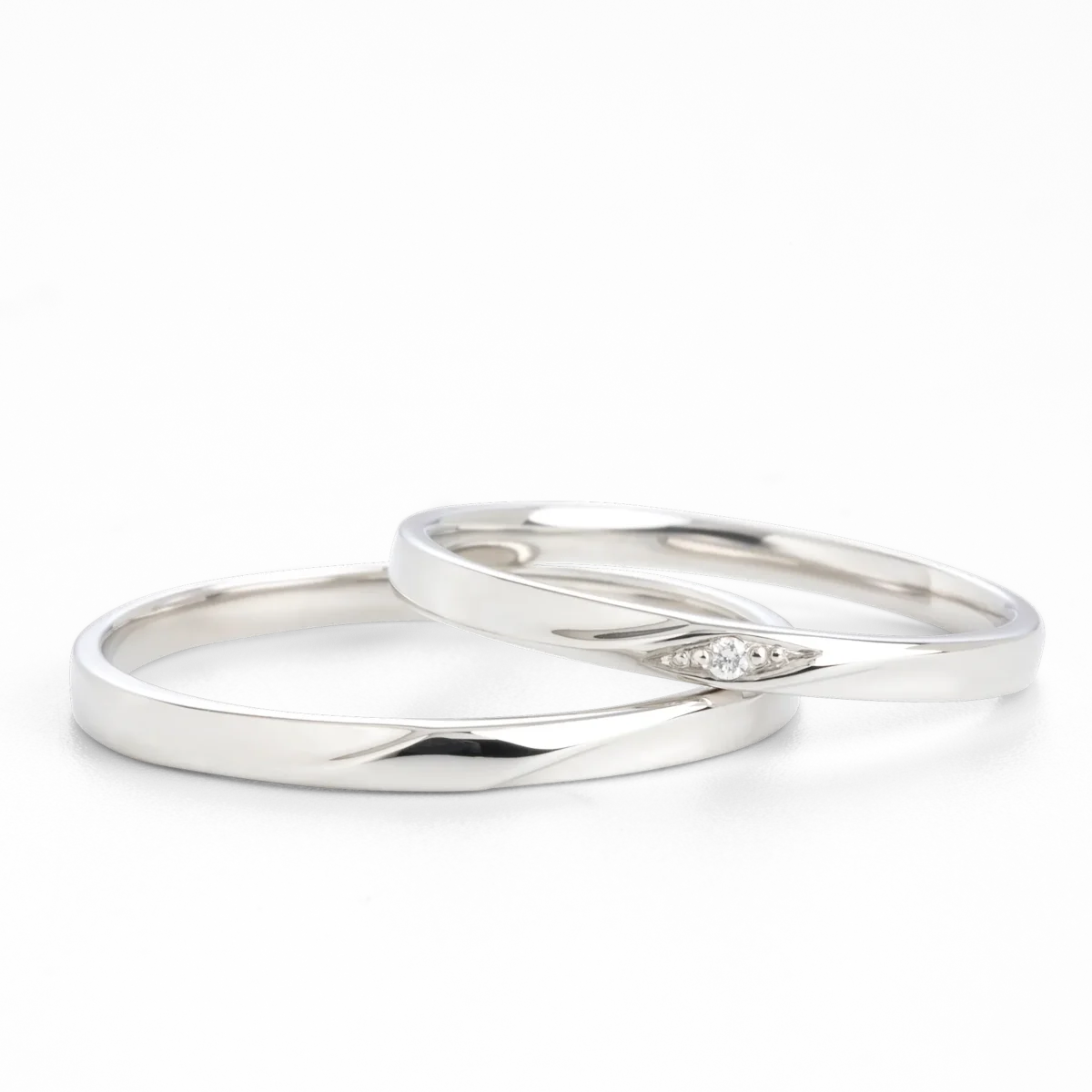 すっきりとしたストレートラインに、斜めに走る2本のラインが繊細なアクセントを添えます。レディースリングには1石のダイヤモンドがさりげなく輝く、シンプルで上品なオールプラチナデザインです。ふたりの歩む未来を、静かに、しっかりと輝き続ける一本です。