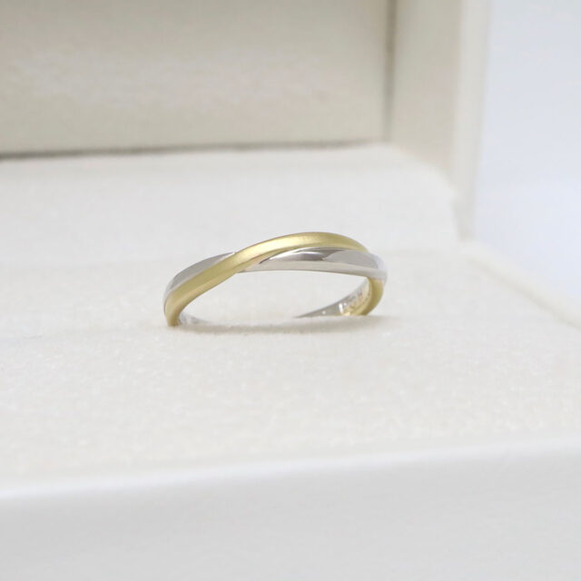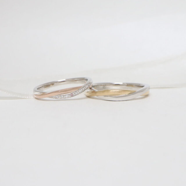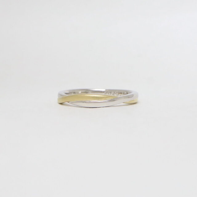 異なる二色の素材が織りなす綾のようなコンビネーションでふたりの想いが紡がれる姿を表現したマリッジリング。(札幌店限定)