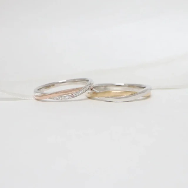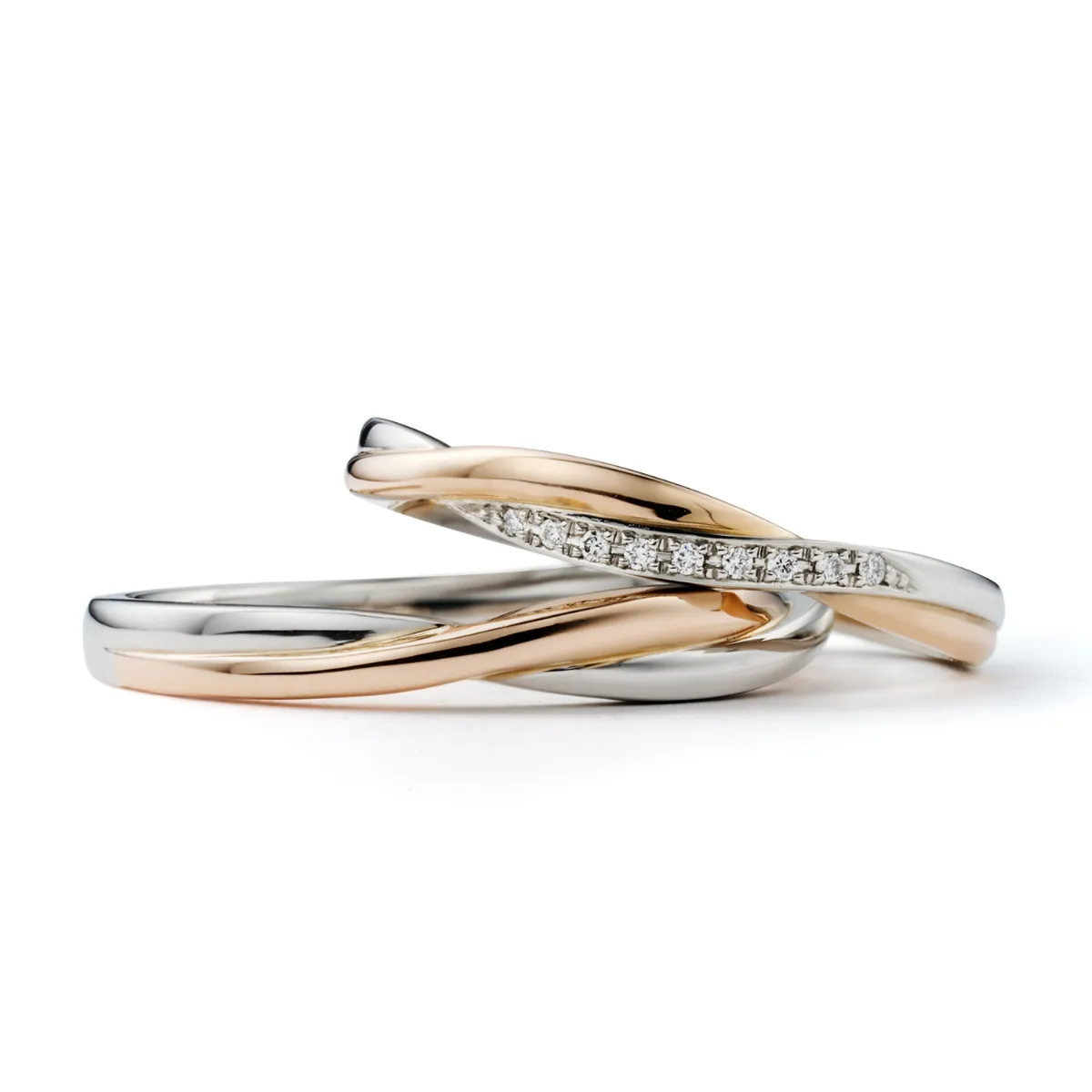 異なる二色の素材が織りなす綾のようなコンビネーションでふたりの想いが紡がれる姿を表現したマリッジリング。(札幌店限定)