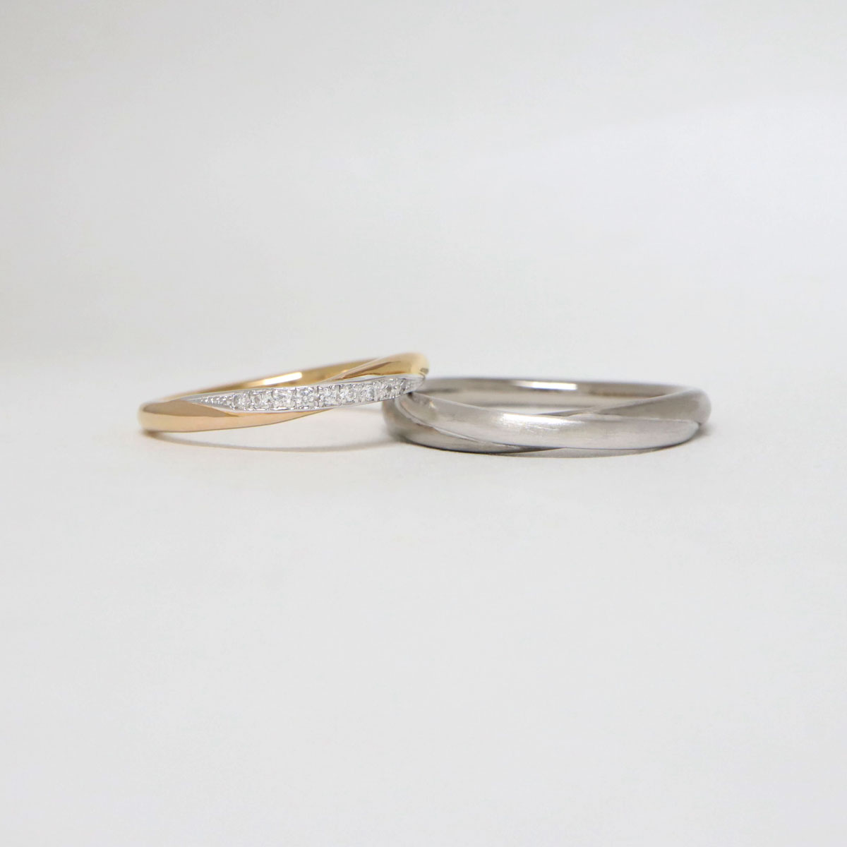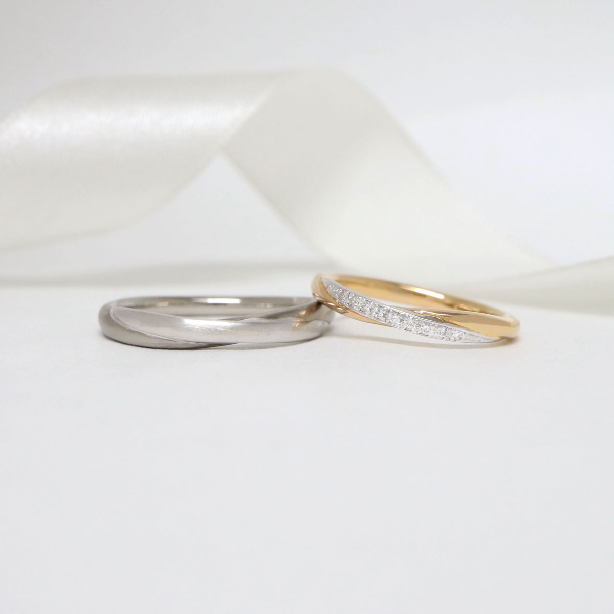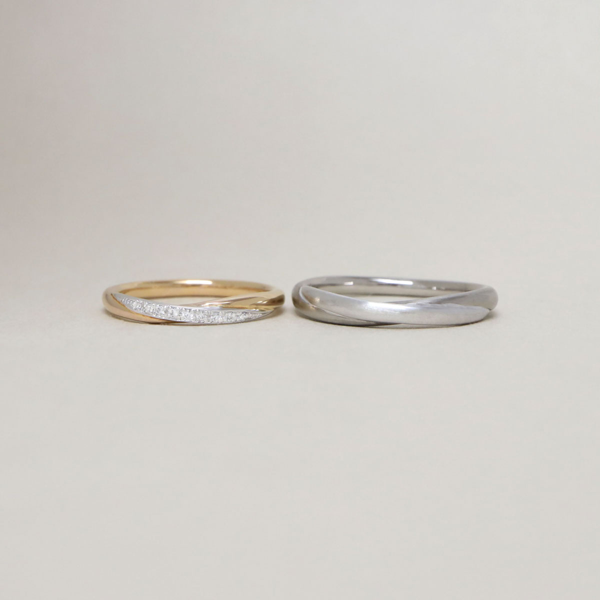 一緒に歩んでいくふたりの人生を、クロスフォルムで表現。ゴールドとプラチナのコントラストが美しく、つい手元を動かしたくなるような表情豊かなデザイン。