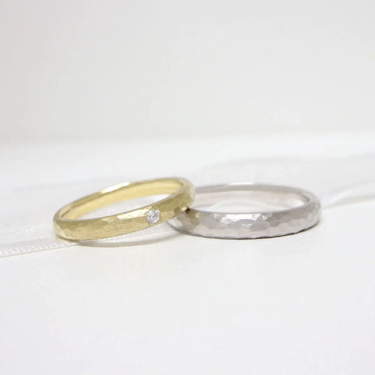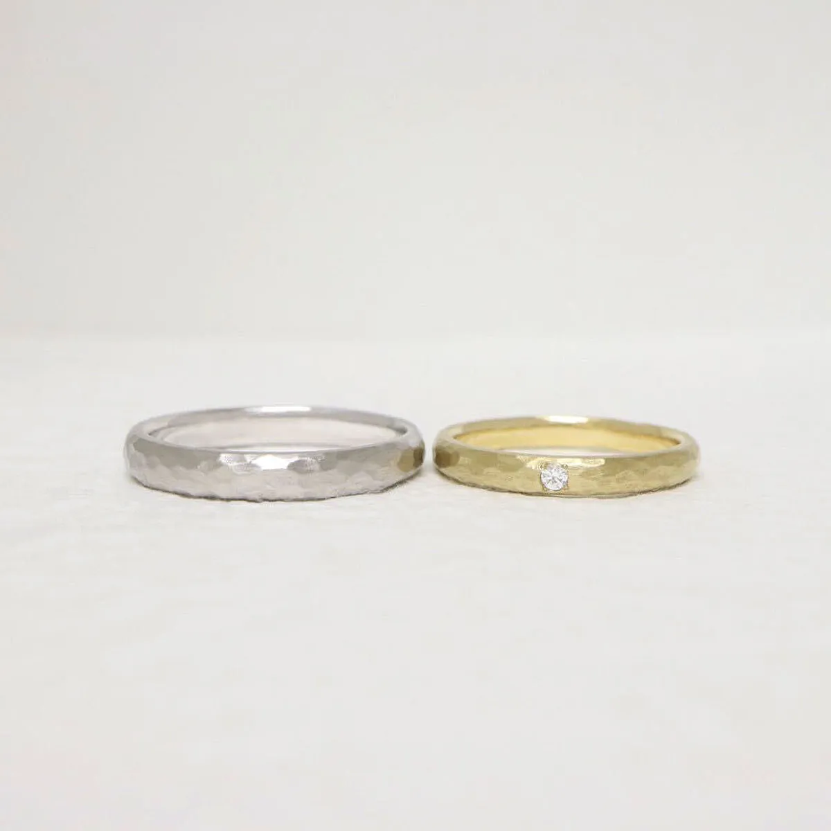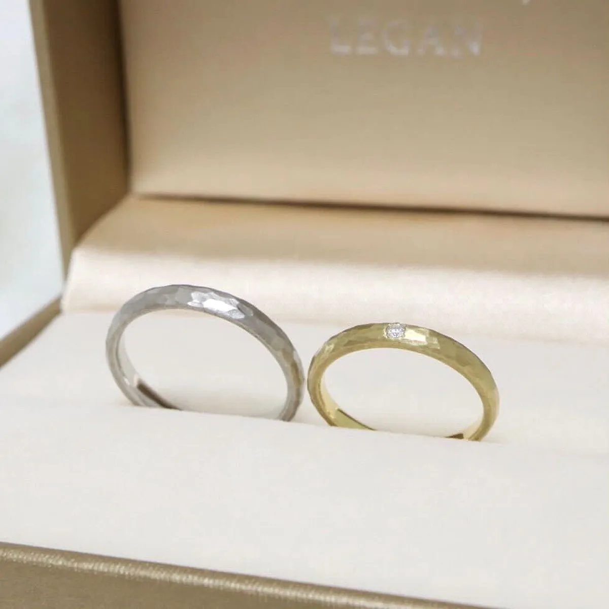 ふたりの想いが共鳴するかのように槌目で仕上げたリングが指を動かすたびに輝くデザイン