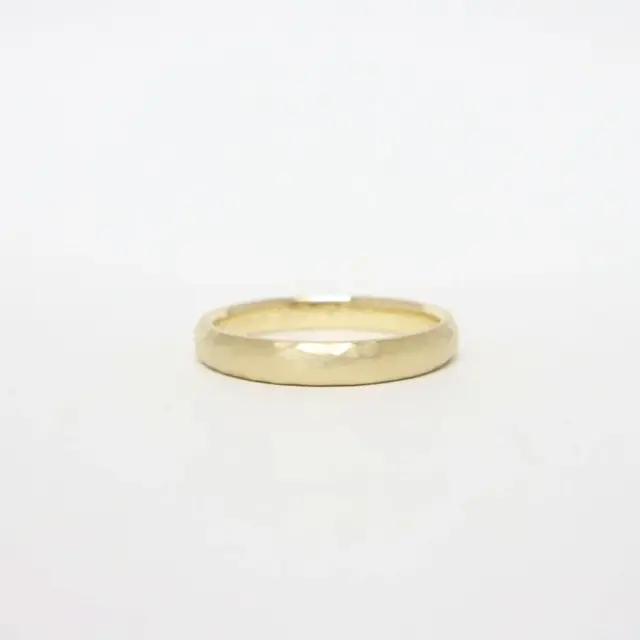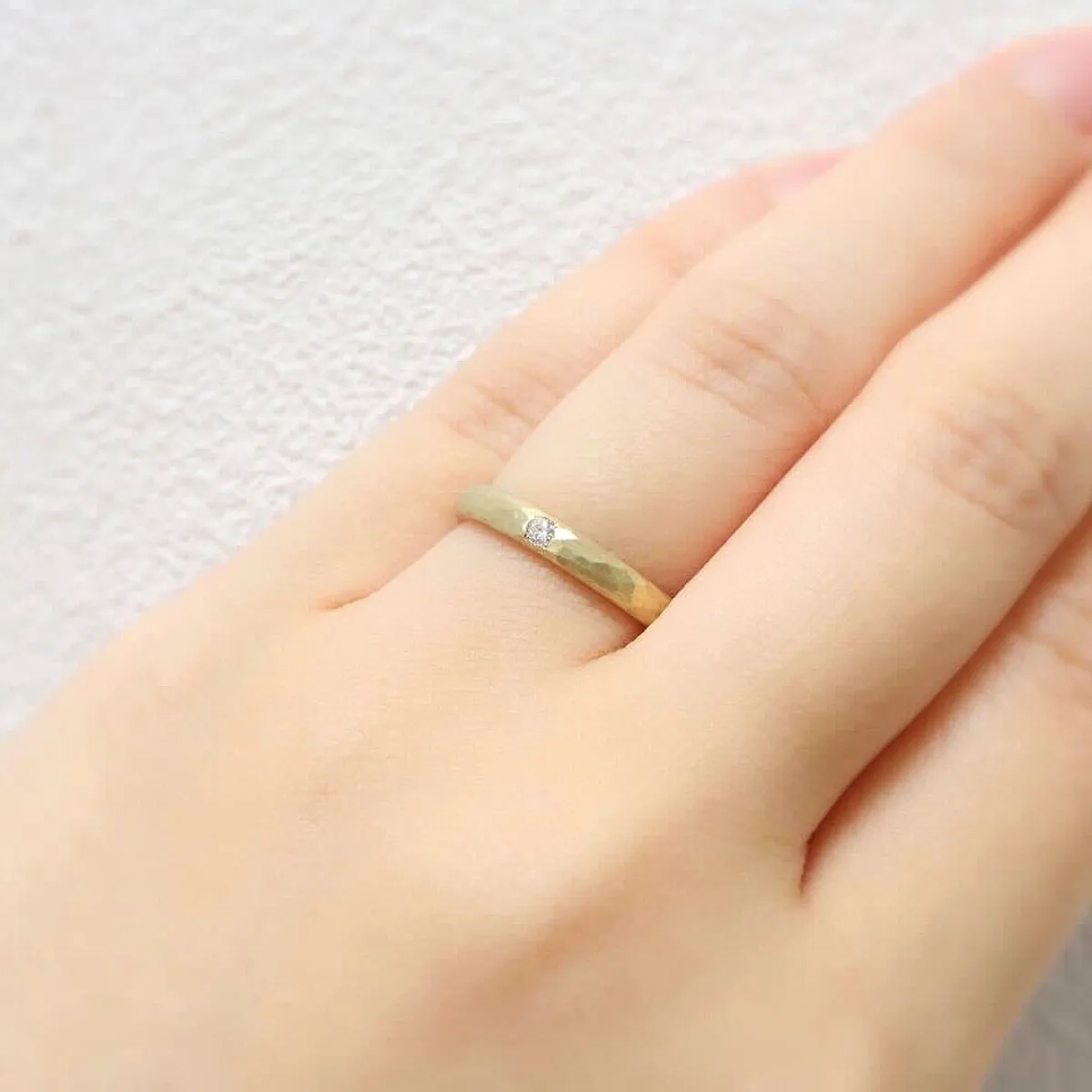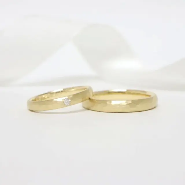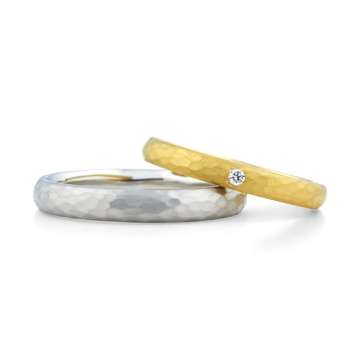 ふたりの想いが共鳴するかのように槌目で仕上げたリングが指を動かすたびに輝くデザイン