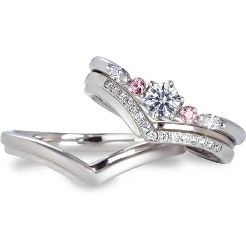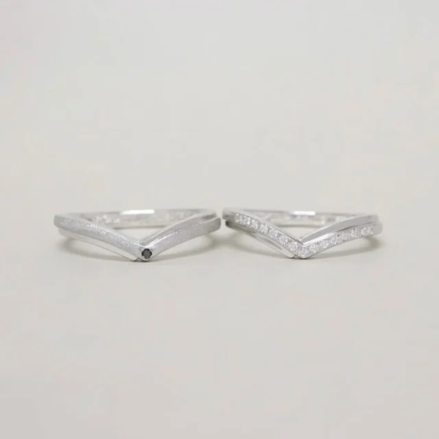 V字の2連になったアームが特徴的なリングでペア感をより強調した仕上がりに。薬指全体にダイヤモンドの煌めきが広がり、指を見るたびに幸せを実感するデザイン。