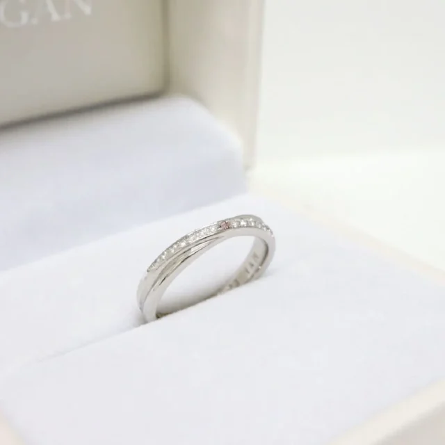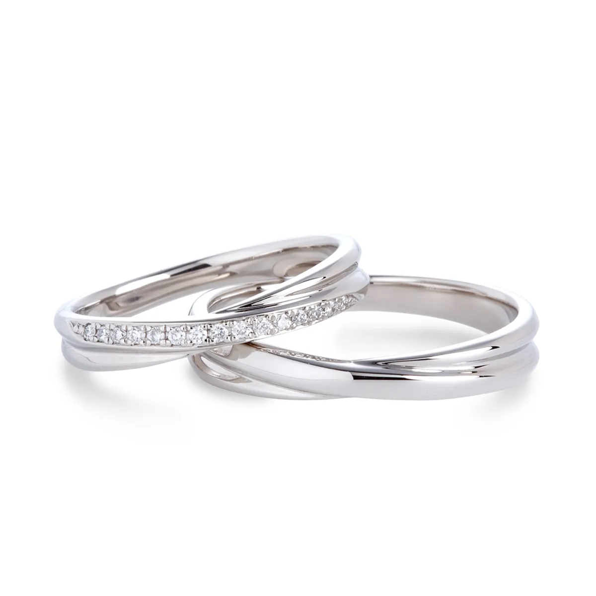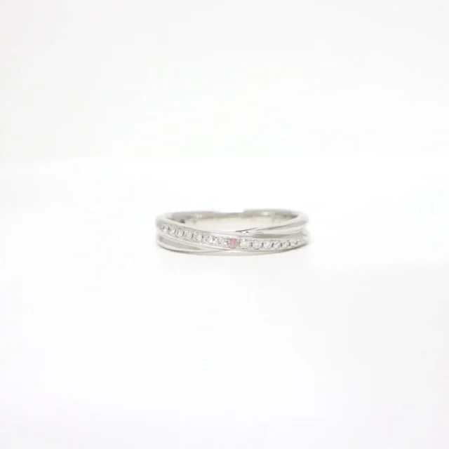 ふたりがいつも支え合って、人生を重ねていくイメージでクロスさせたストレートライン。15石のダイヤモンドはどの角度からも華やかに煌めきます。