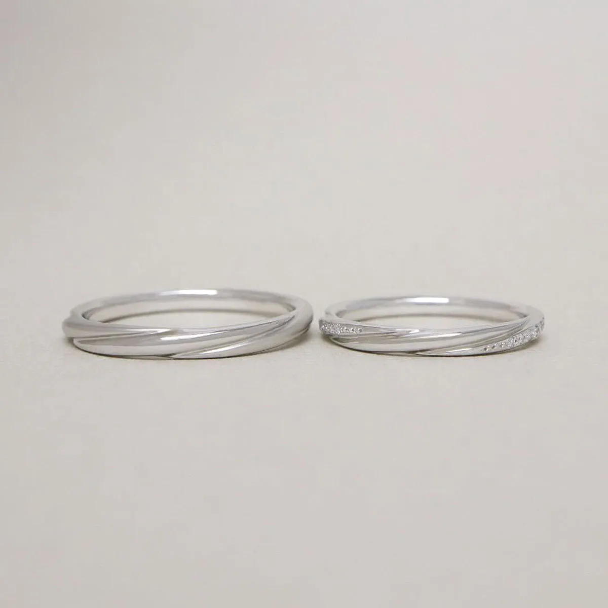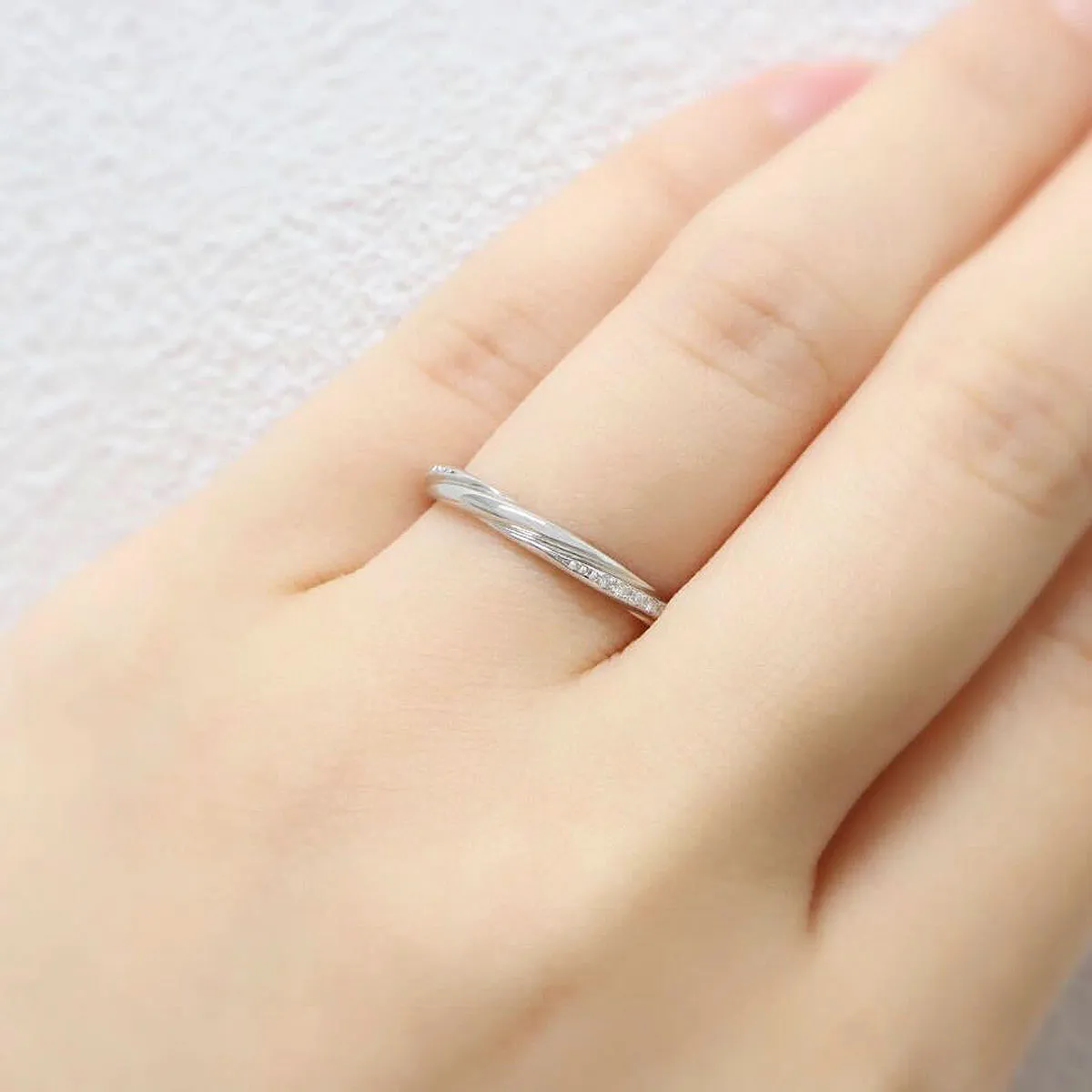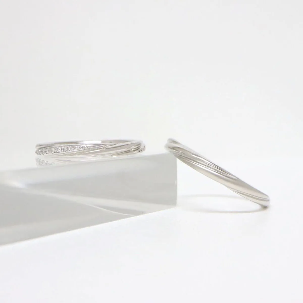 リボンで結ばれた揺るがないふたりの絆の象徴のように。両サイドにメレダイヤが曲線のように施され、リングが回ってしまってもデザインを美しく保ちます。