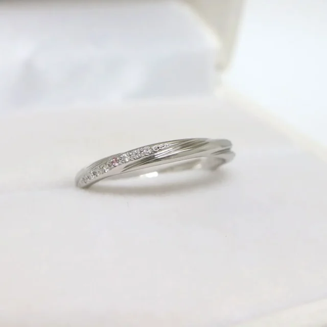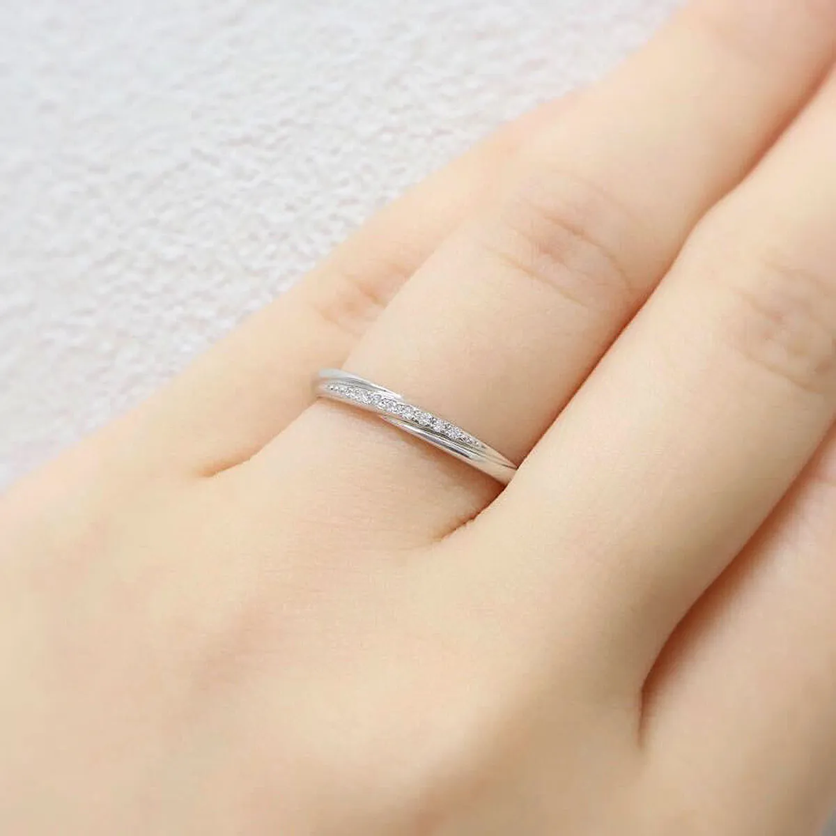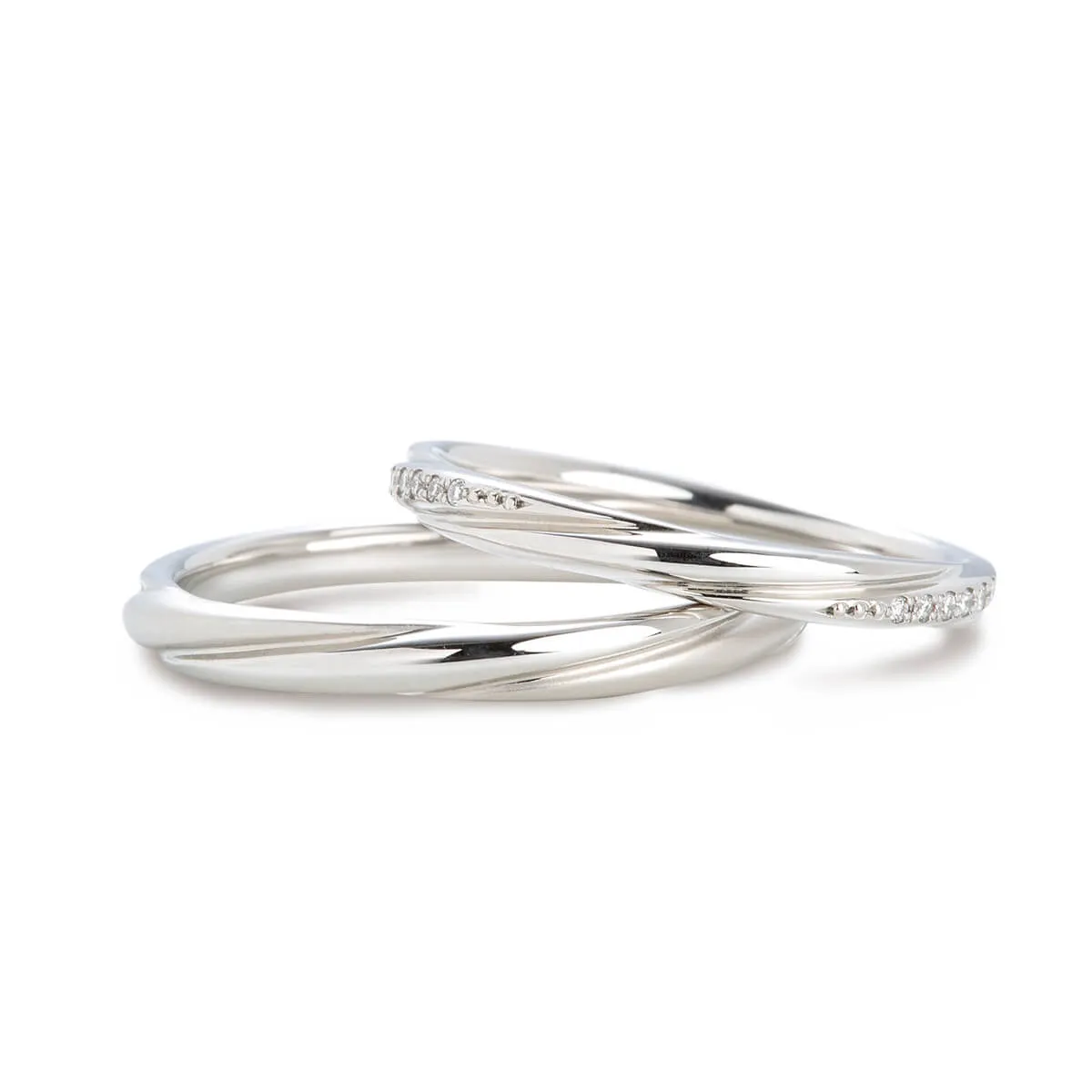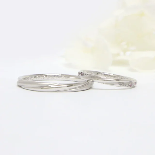 リボンで結ばれた揺るがないふたりの絆の象徴のように。両サイドにメレダイヤが曲線のように施され、リングが回ってしまってもデザインを美しく保ちます。