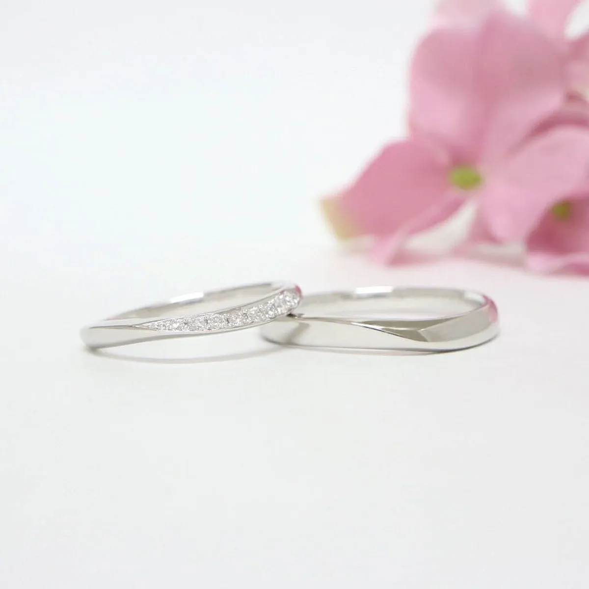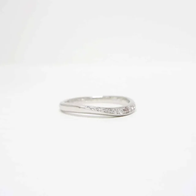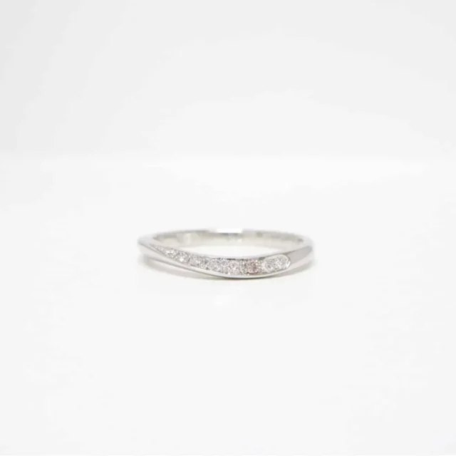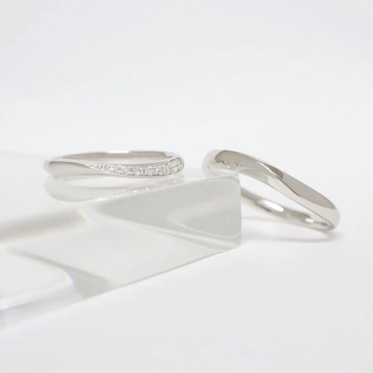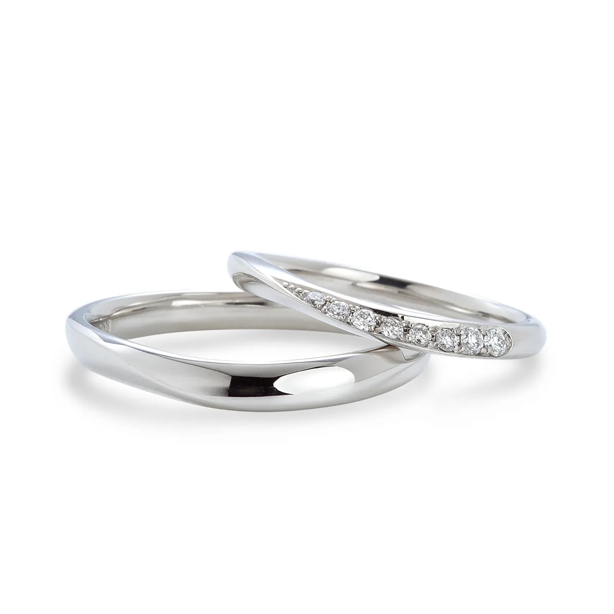 しなやかなカーブが印象的な結婚指輪。その日の気分で向きを変えてつけれる表情豊かなデザイン。アシンメトリーにセッティングされたメレダイヤモンドの留め方もまた、職人の技術が光ります。