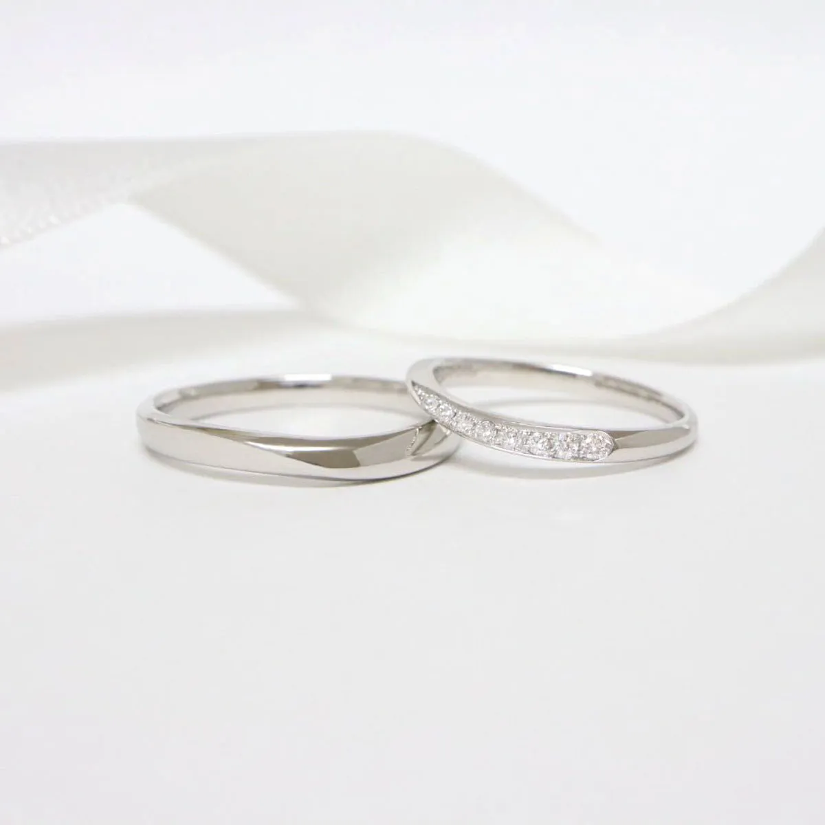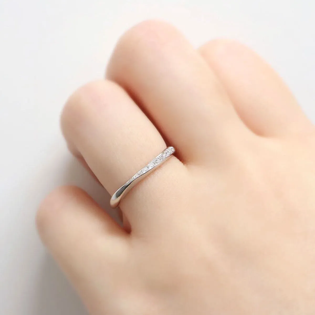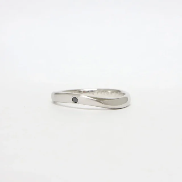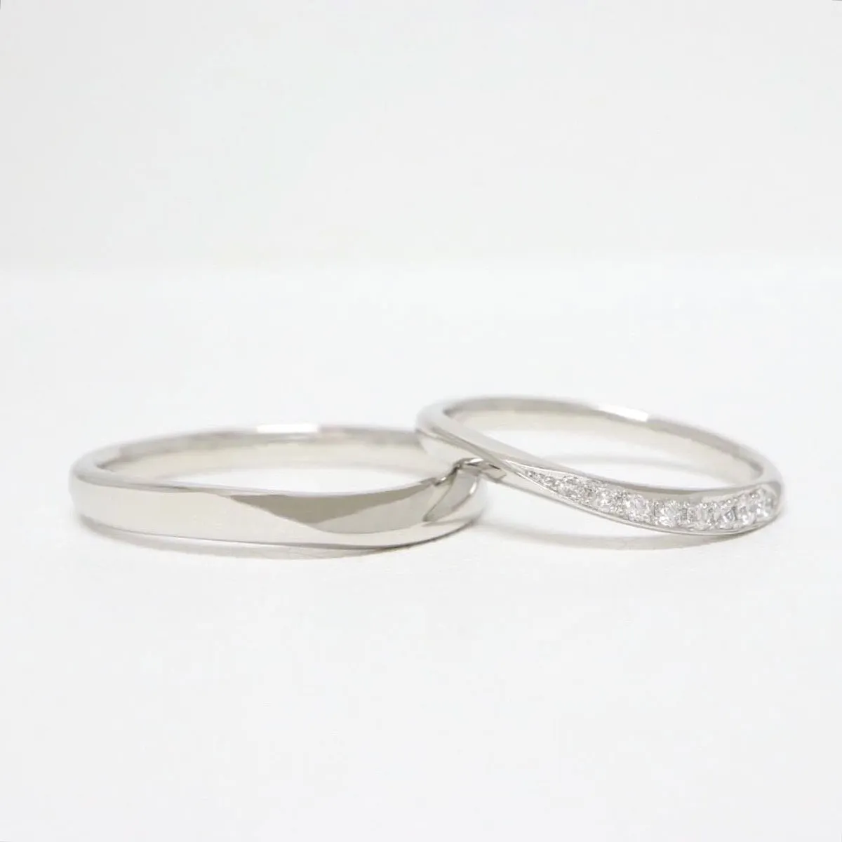しなやかなカーブが印象的な結婚指輪。その日の気分で向きを変えてつけれる表情豊かなデザイン。アシンメトリーにセッティングされたメレダイヤモンドの留め方もまた、職人の技術が光ります。