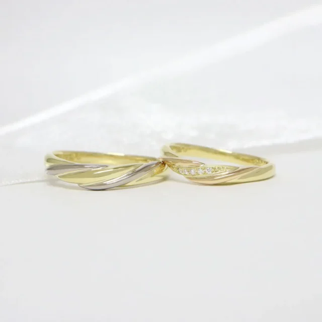 指元を綺麗に魅せるV字のラインに躍動感のあるゴールドが引き立つ結婚指輪。ふたりの強い絆を想わせる曲線が印象的。