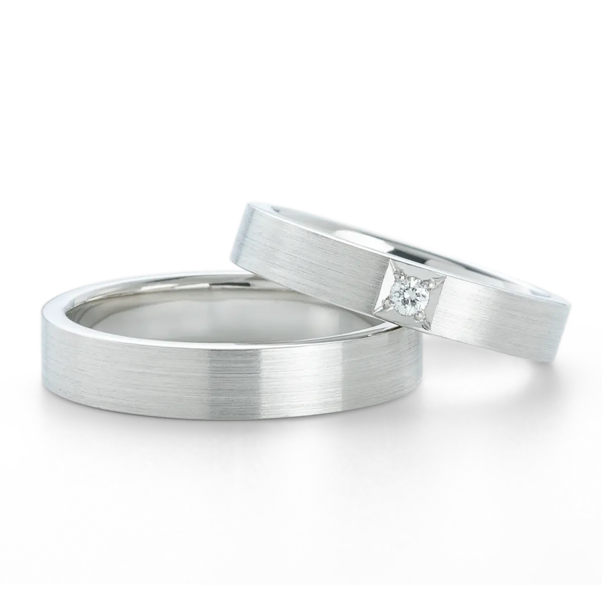 出会うべくして出会った運命のふたりをイメージし、煌びやかな1石のメレダイヤモンドは、ふたりの絆の象徴。幅広でシンプルなデザイン。