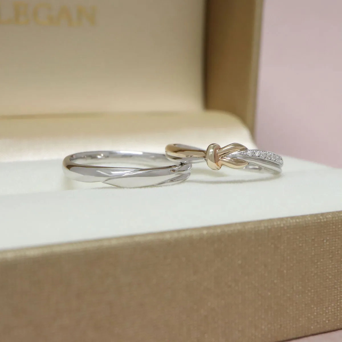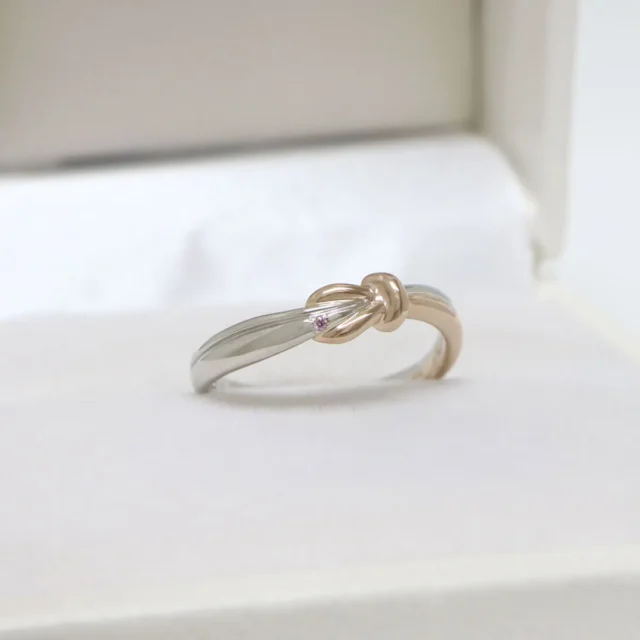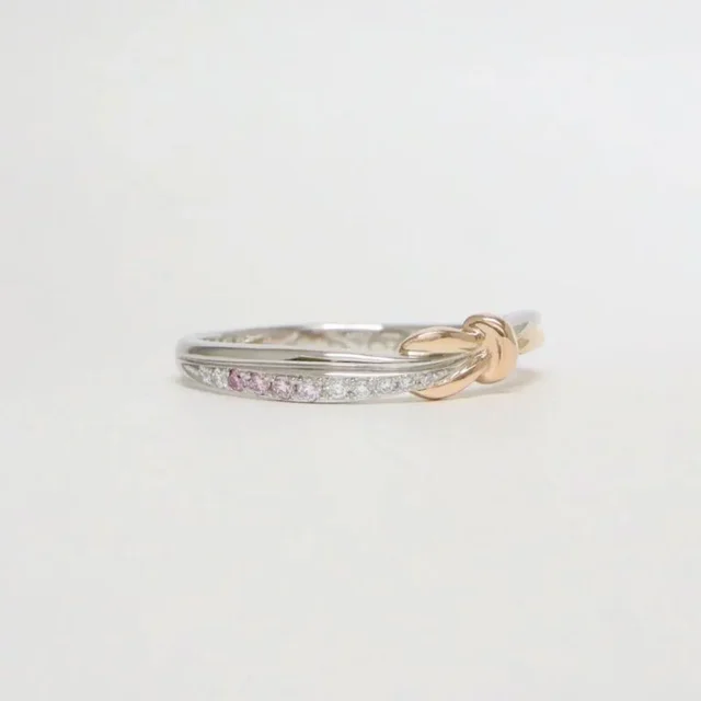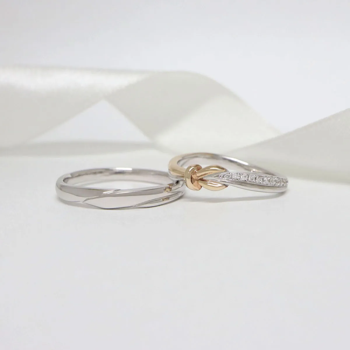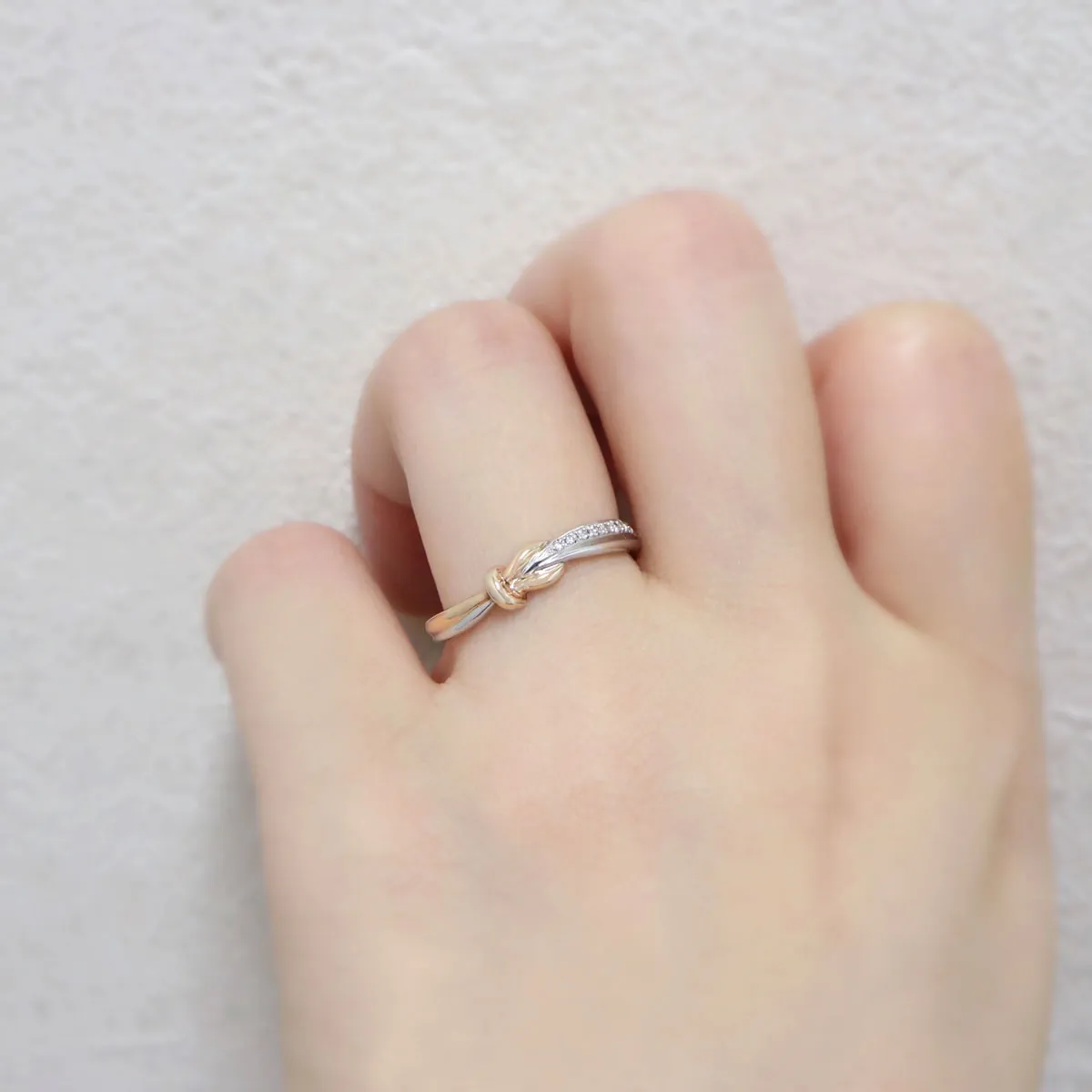 運命の象徴でもある、ふたりをつなぐリボンをイメージ。プラチナとピンクゴールドで立体感を出し、よりリボンの結び目を強調するように仕上げました。細かく敷き詰められたメレダイヤモンドたちがふたりを祝福してくれます。