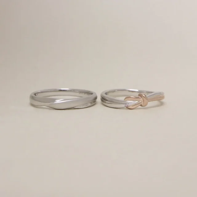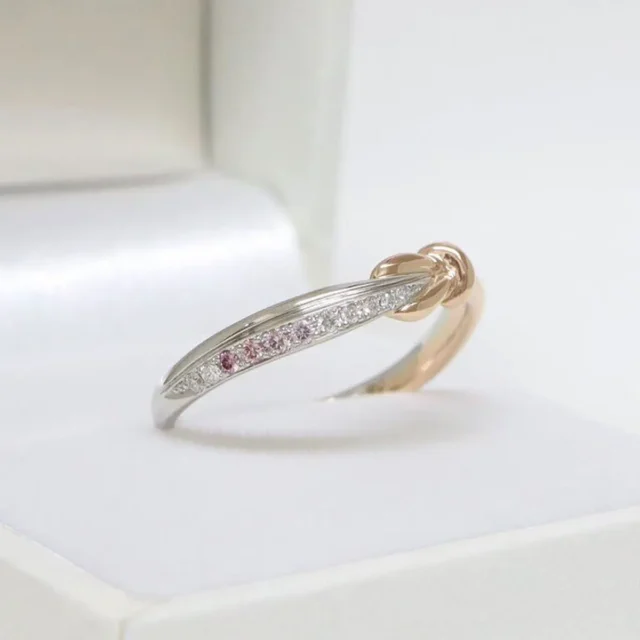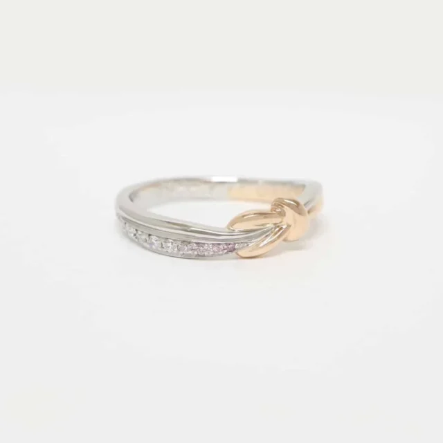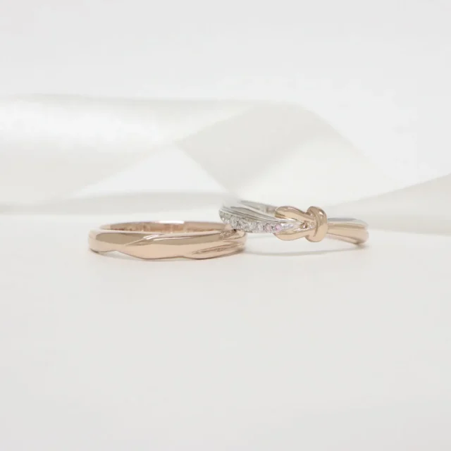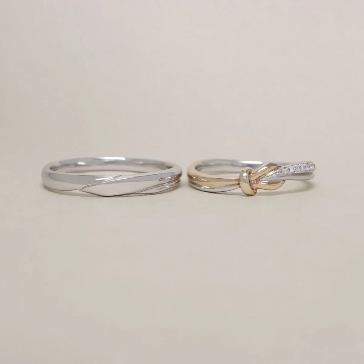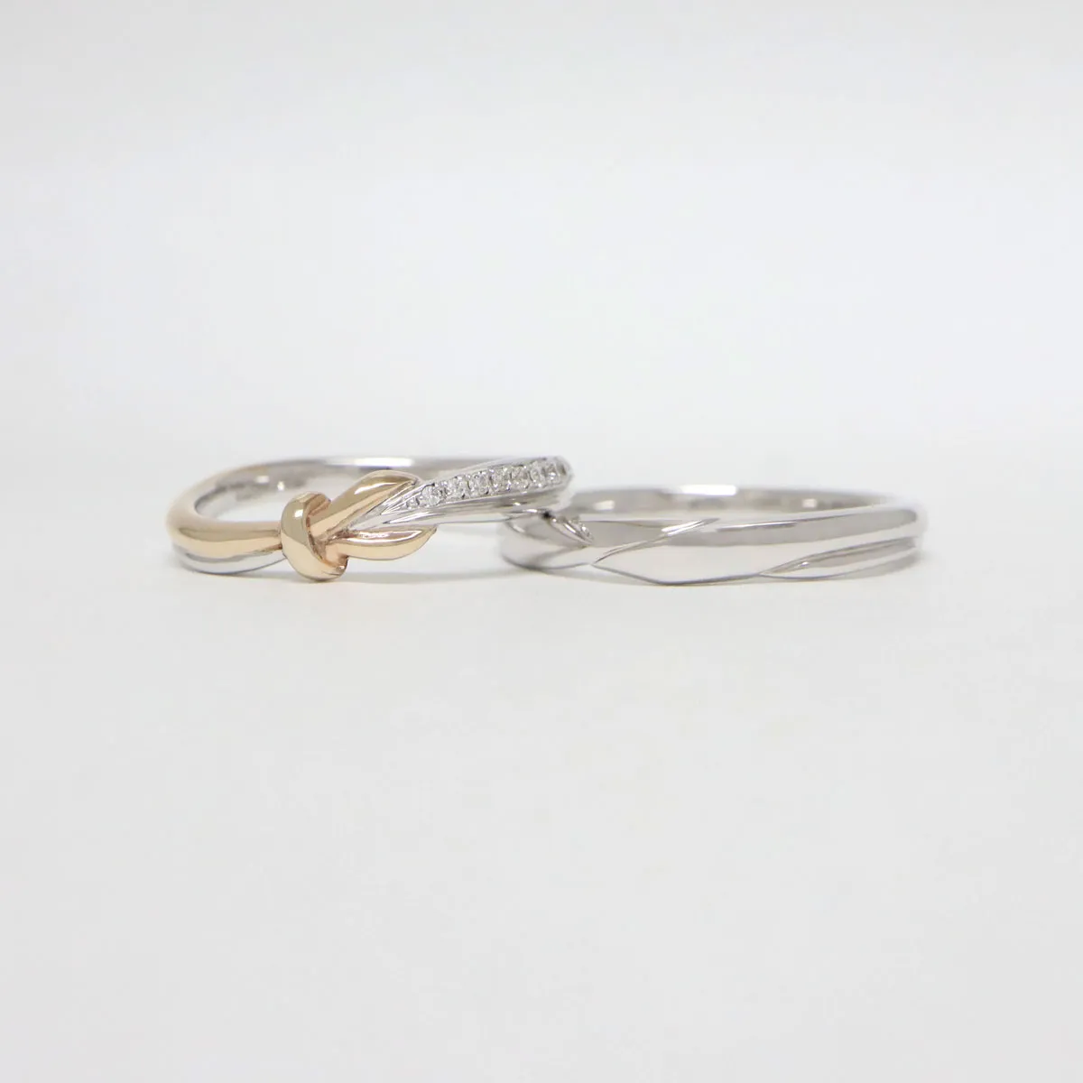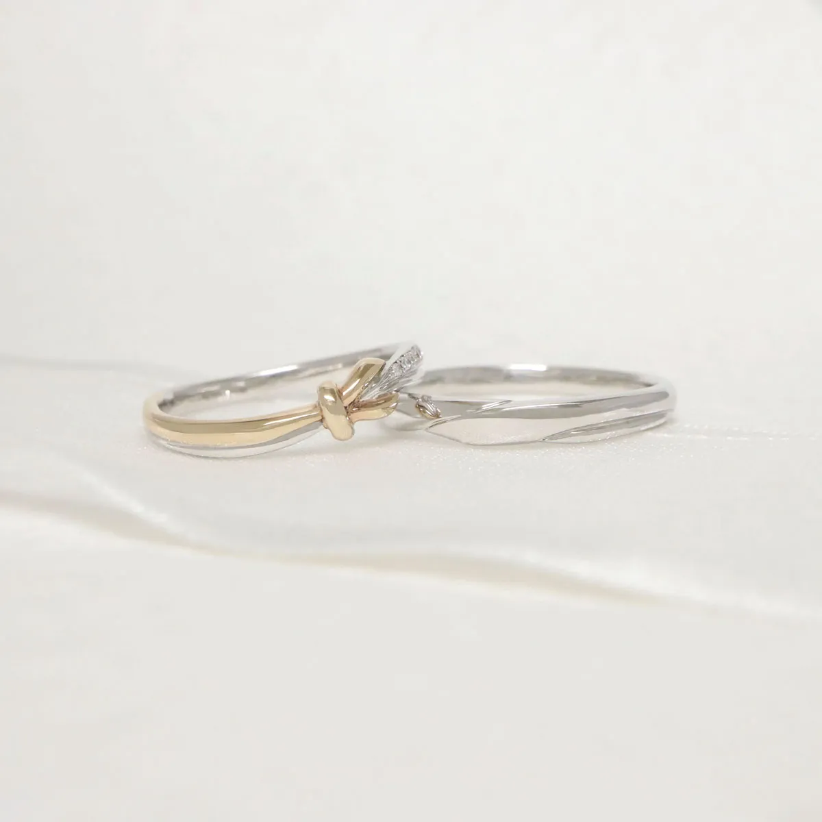 運命の象徴でもある、ふたりをつなぐリボンをイメージ。プラチナとピンクゴールドで立体感を出し、よりリボンの結び目を強調するように仕上げました。細かく敷き詰められたメレダイヤモンドたちがふたりを祝福してくれます。