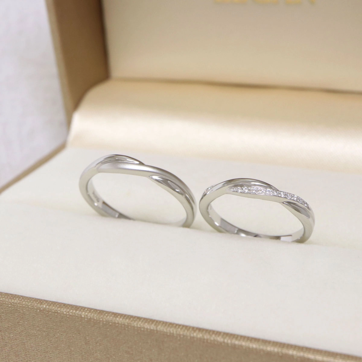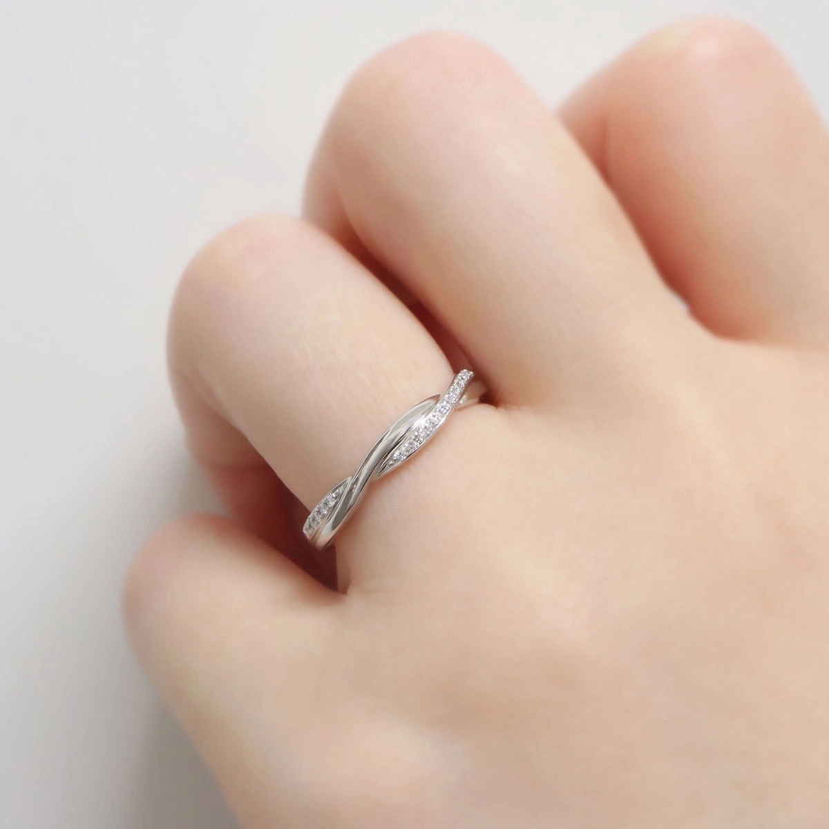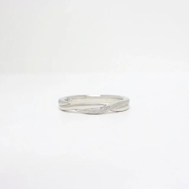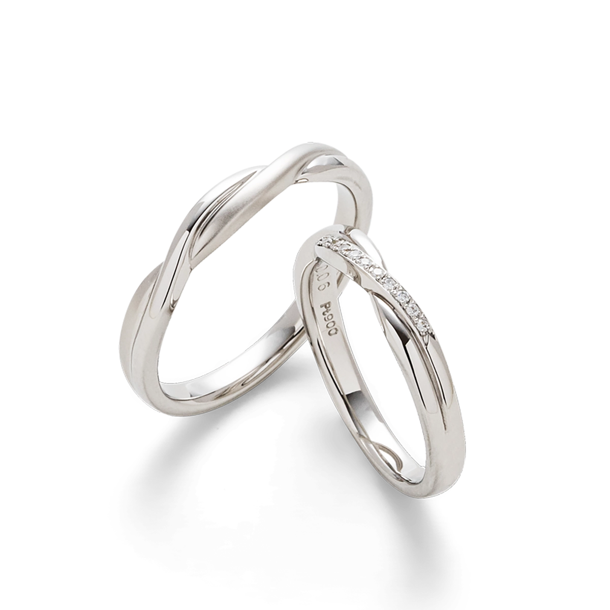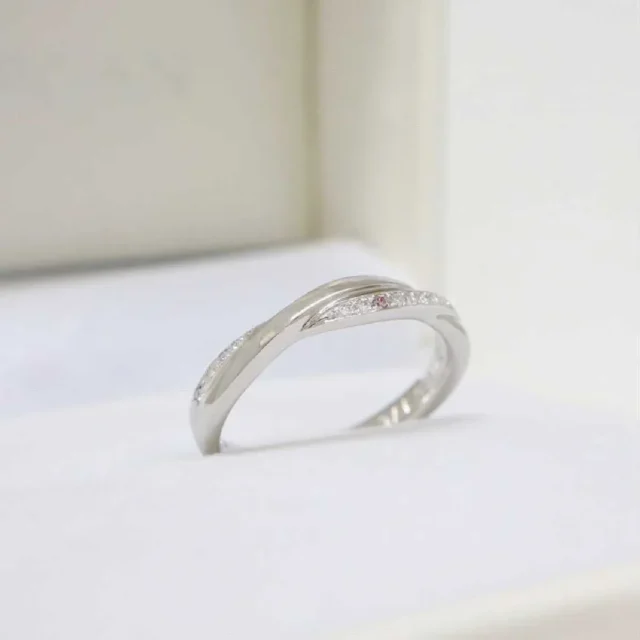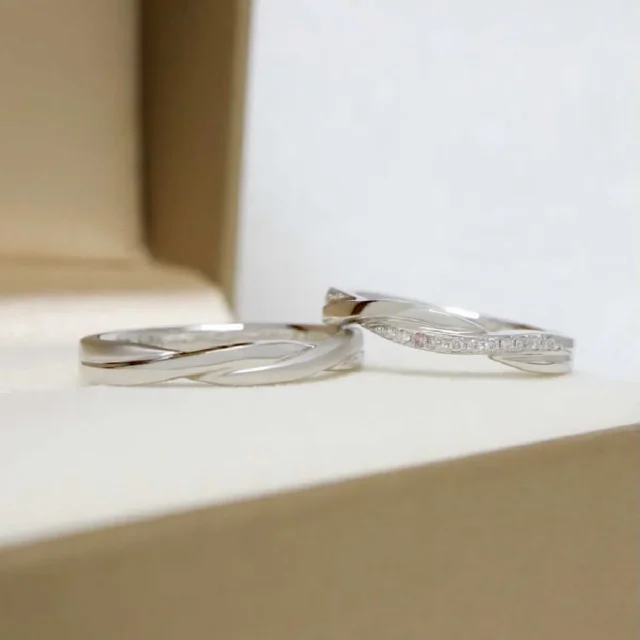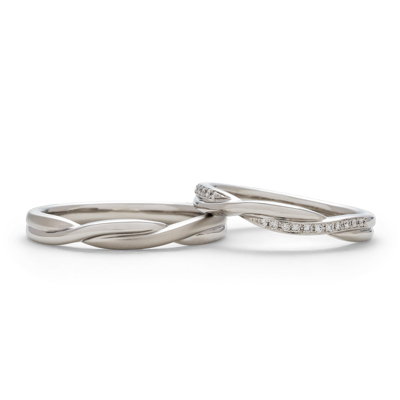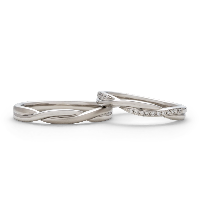 交差するようなシルエットでプラチナの素材感が美しい印象の結婚指輪。繊細なメレダイヤモンドたちが指元を動かすたびに表情豊な輝きで薬指を魅了します。