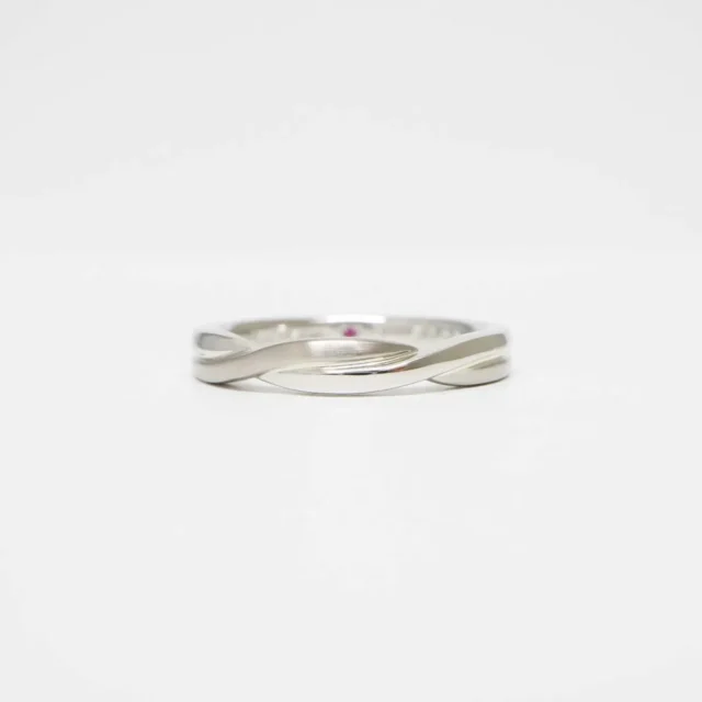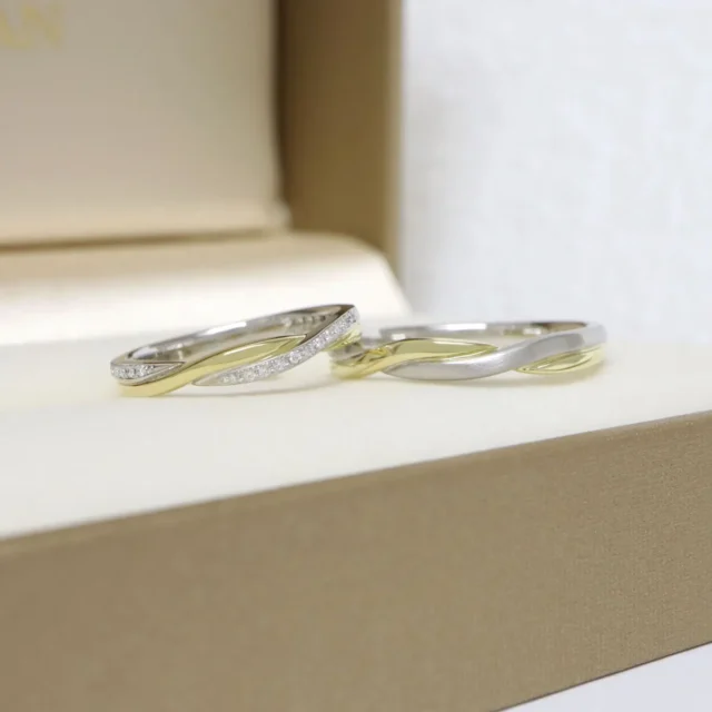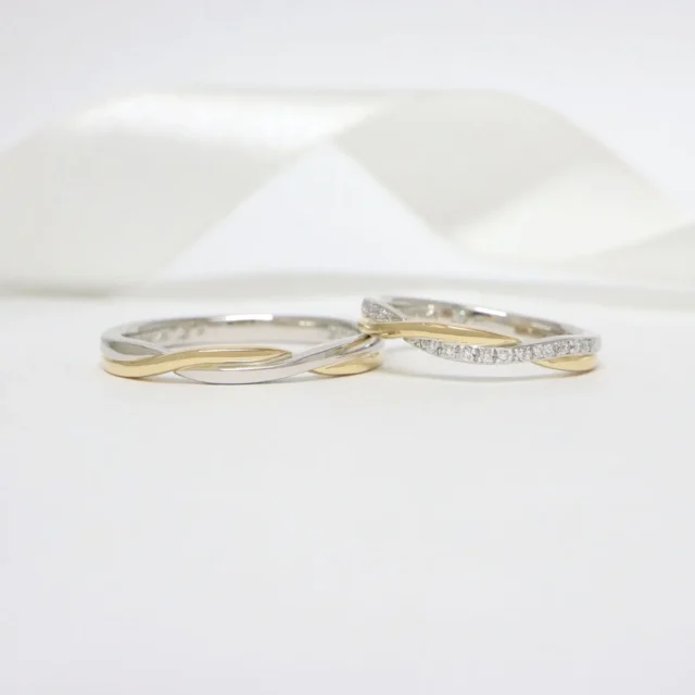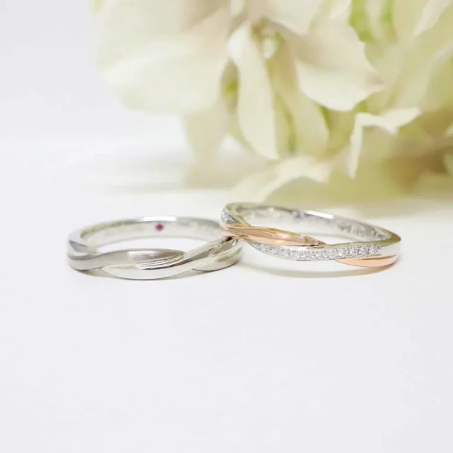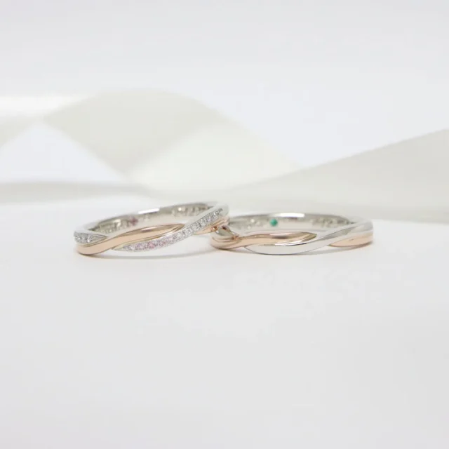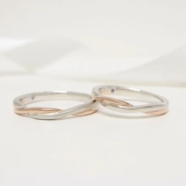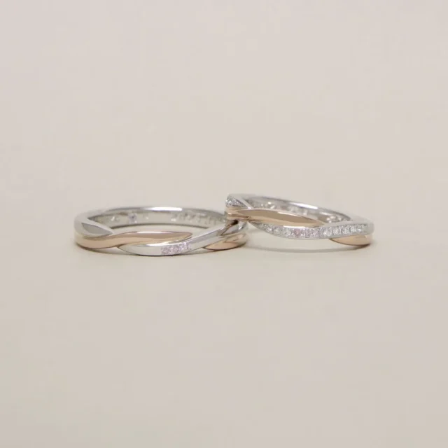 プラチナとピンクゴールドの素材が美しいコントラストを放つ結婚指輪。繊細なメレダイヤモンドたちが指元を動かすたびに表情豊な輝きで薬指を魅了します。
