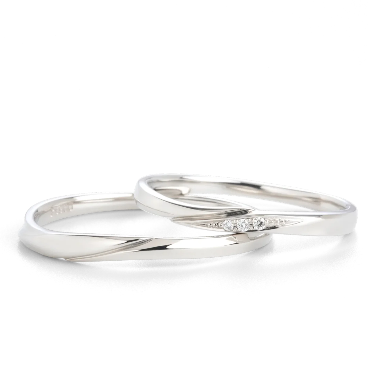ゆるいウェーブラインに3石のリングに刻まれたラインがデザインのスパイスに。ラインは寄り添う二人の絆をイメージしています。指を華奢に美しく見せてくれる細身ウェーブタイプ。