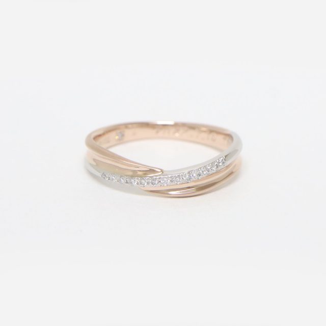 クロス感がより引き立つよう、ゆるやかな流れに添ってダイヤモンドをあしらい、マットとグロスで交互に仕上げた質感が洗練されたデザイン。同型のオールプラチナタイプも有り。