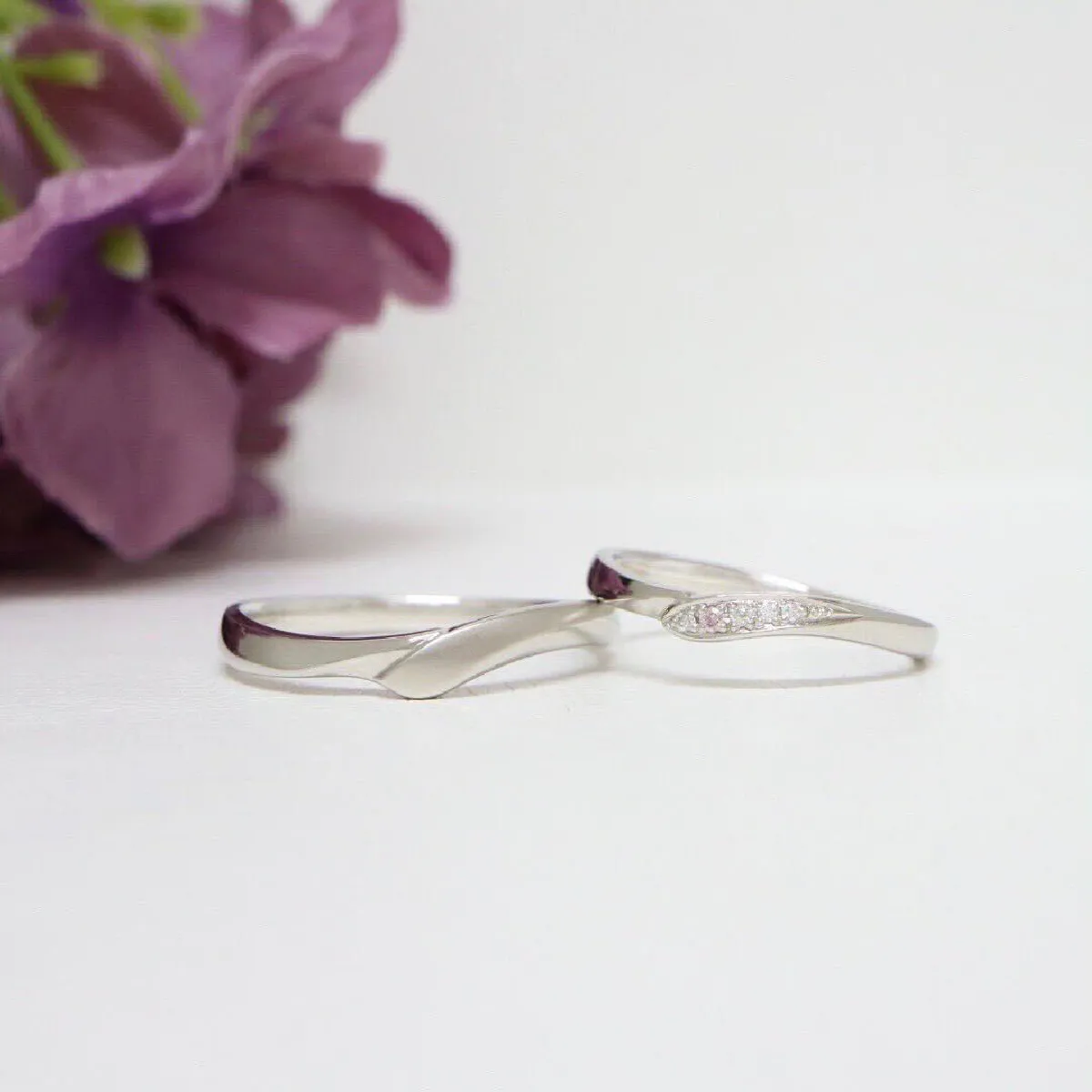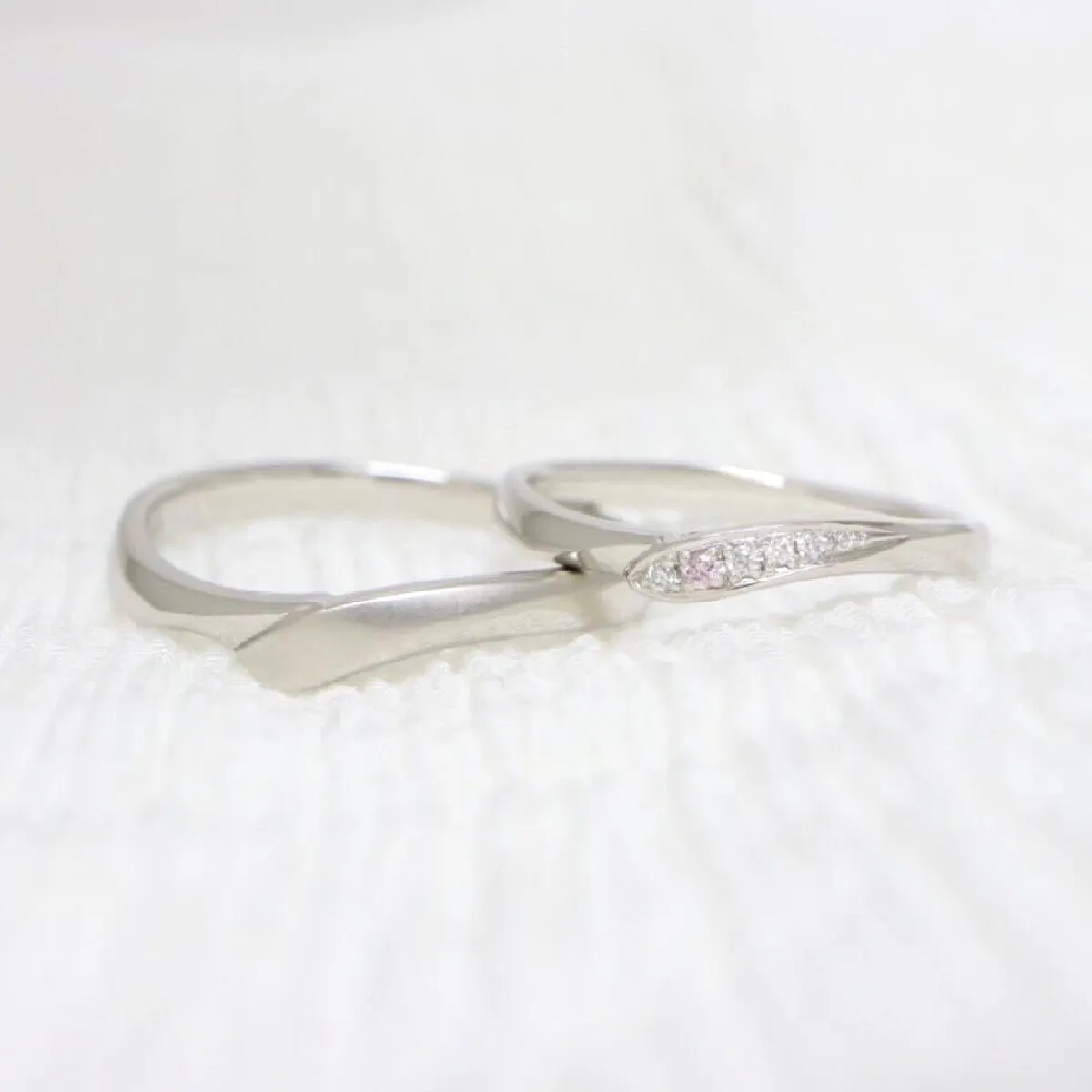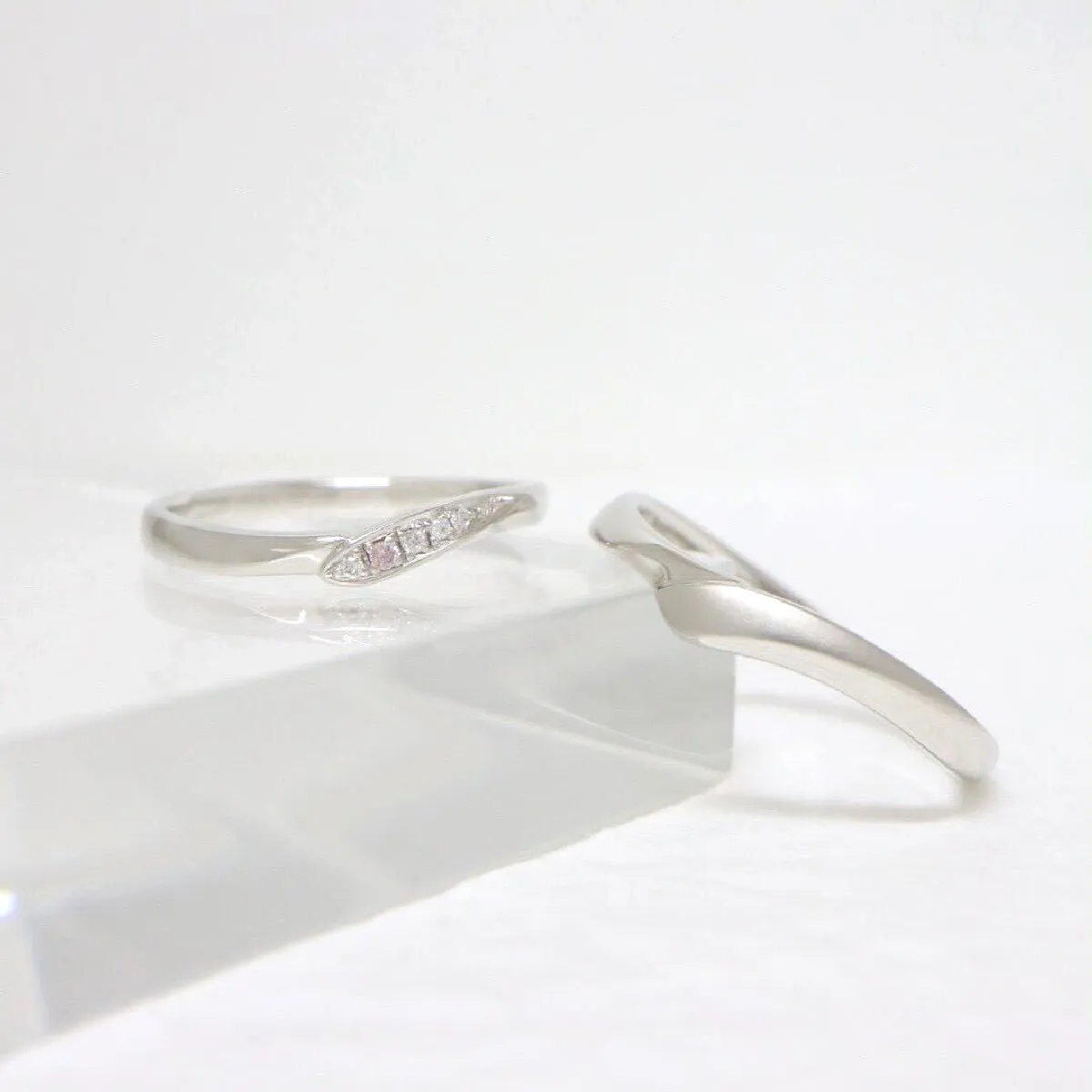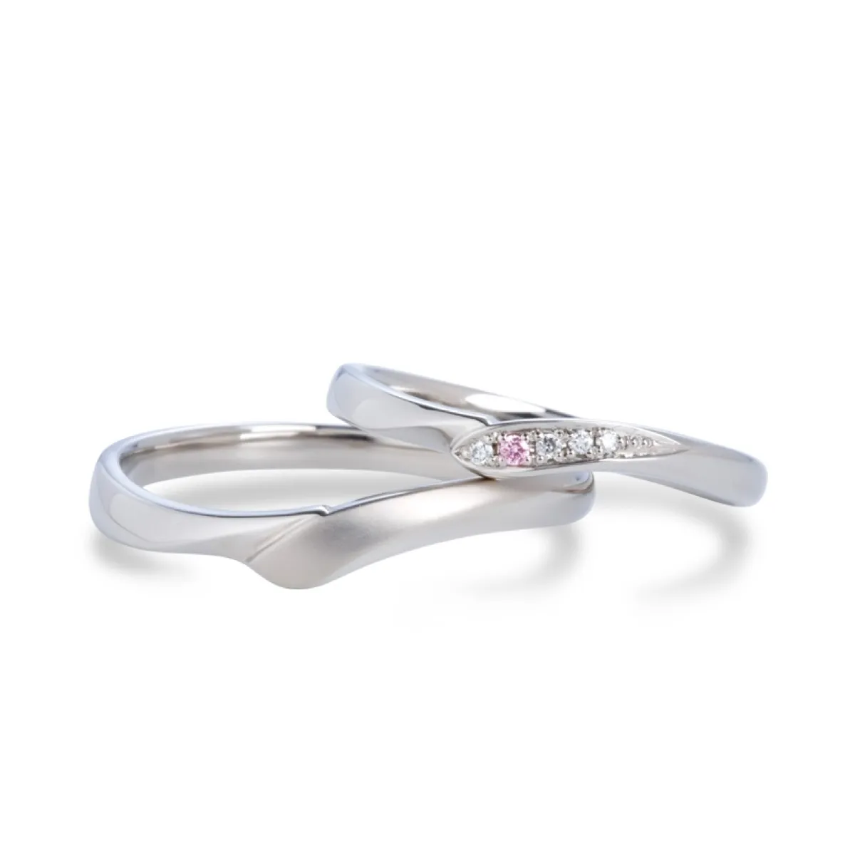 指をすっきり見せてくれる効果のある緩めのV字ライン。ワンポイントにセッティングしたピンクダイヤが華やかさを演出。ピンクダイヤモンドの石言葉は「永遠の愛」永遠を誓い合ったふたりに相応しいダイヤモンドです。