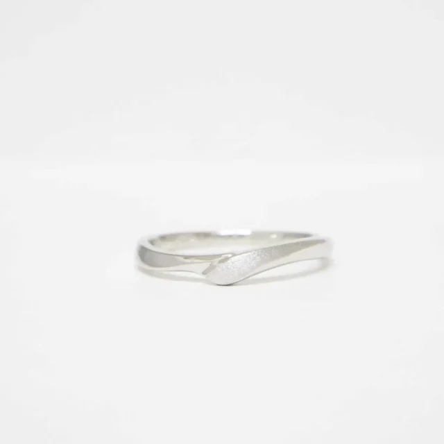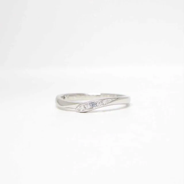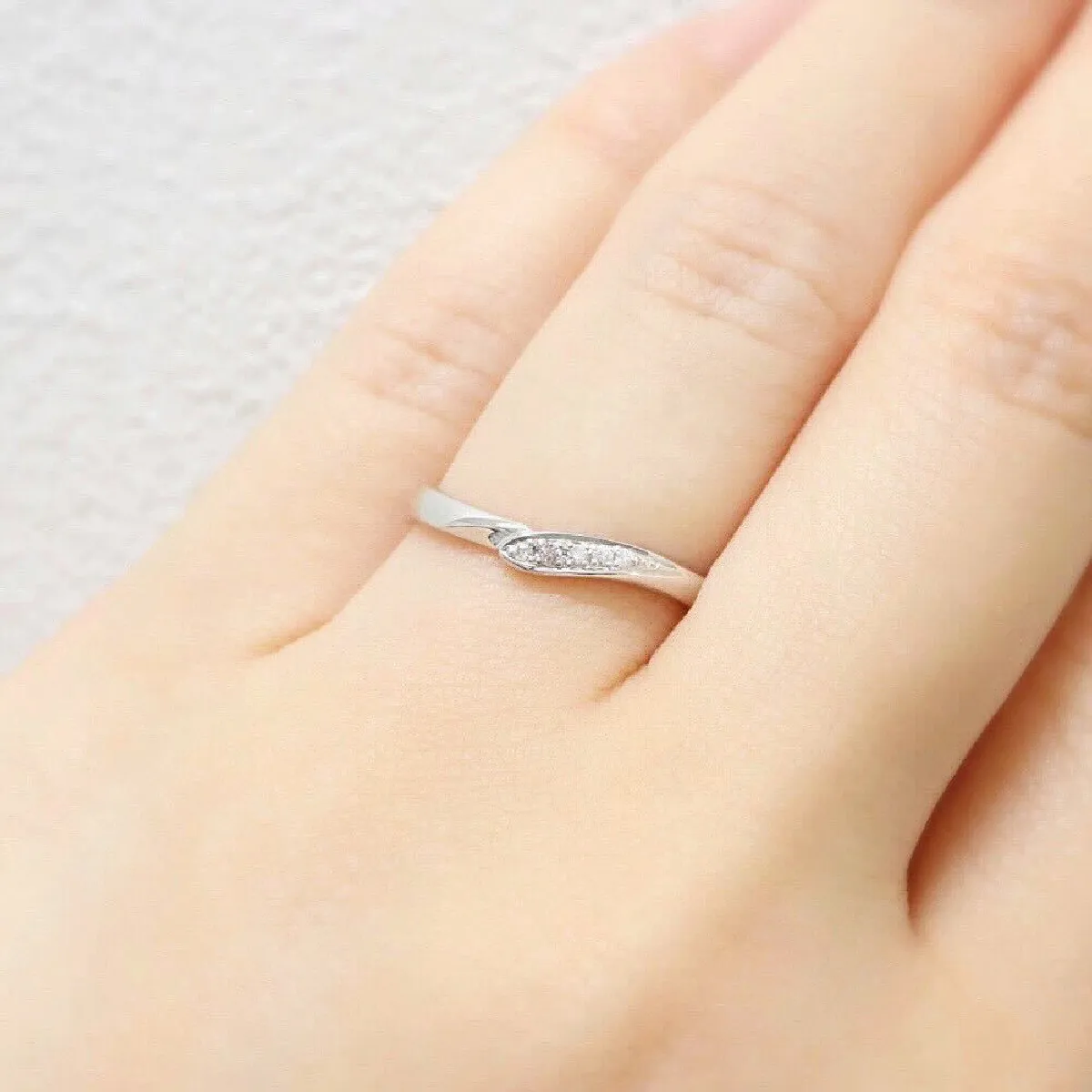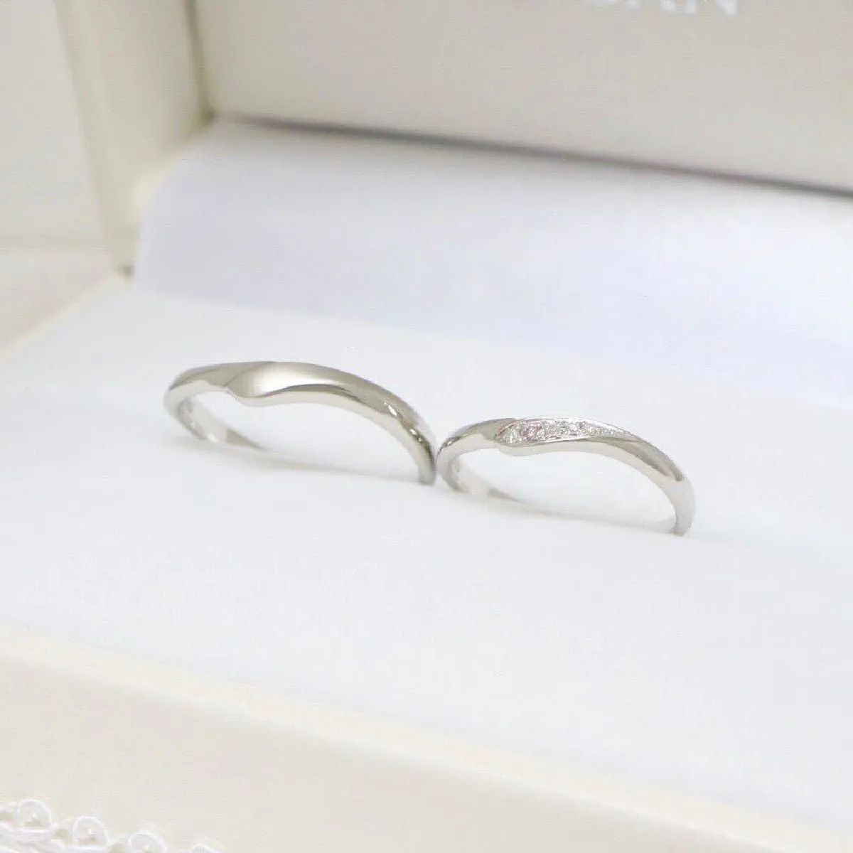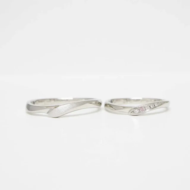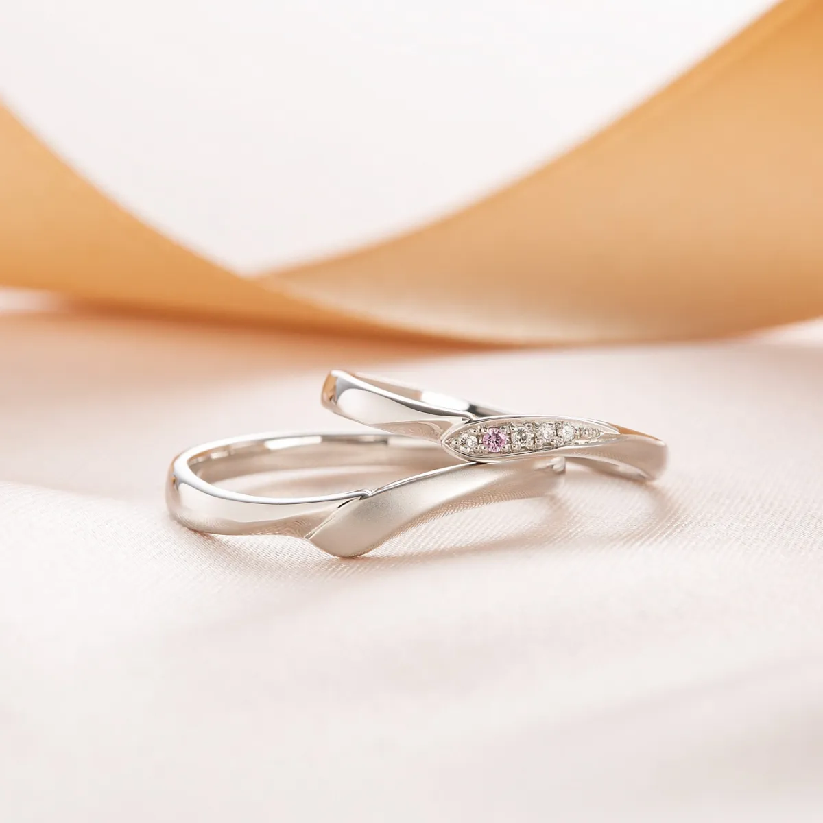 指をすっきり見せてくれる効果のある緩めのV字ライン。ワンポイントにセッティングしたピンクダイヤが華やかさを演出。ピンクダイヤモンドの石言葉は「永遠の愛」永遠を誓い合ったふたりに相応しいダイヤモンドです。