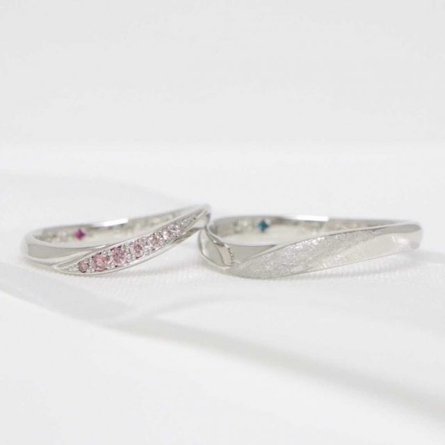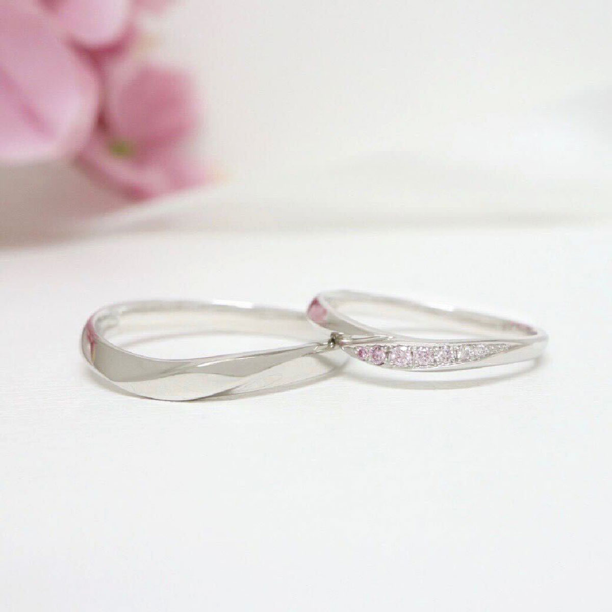 なめらかな曲線に合わせて留めたピンクダイヤのグラデーションが美しいマリッジリング。いつまでも愛し合うふたりに相応しい特別な指輪です。