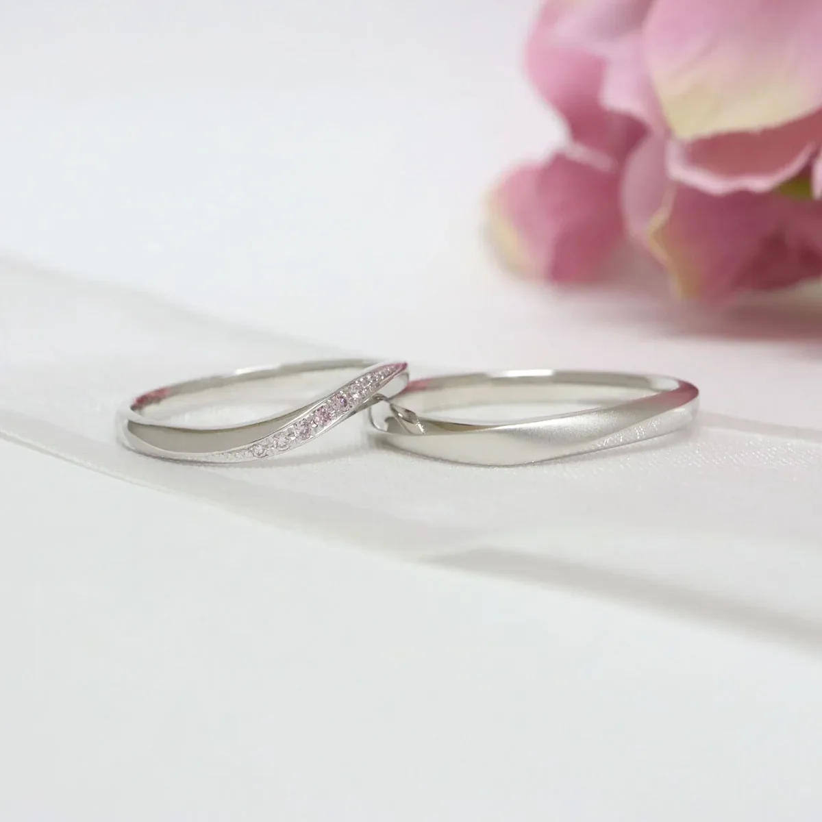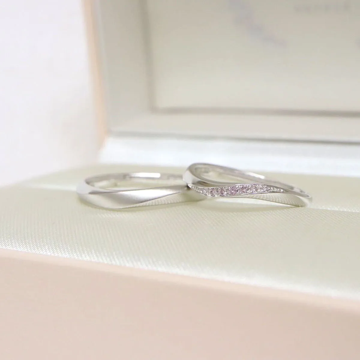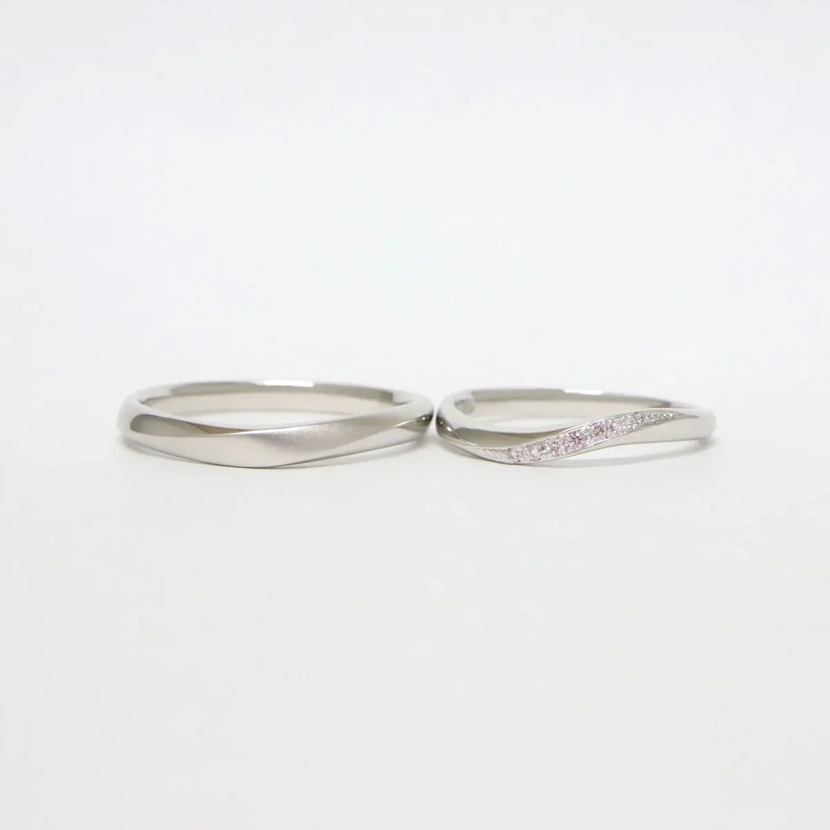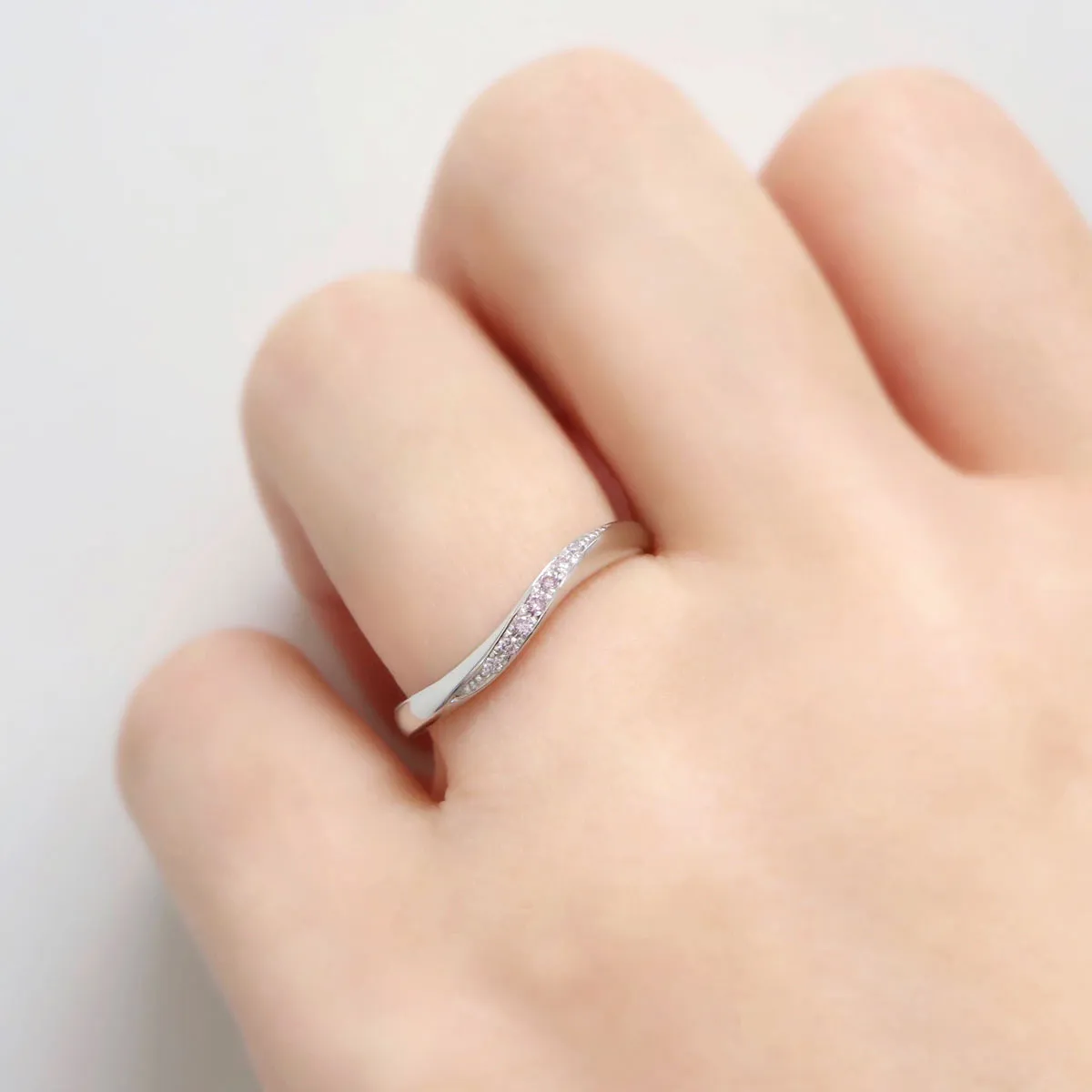 着け心地の良さを追求したなめらかな曲線に合わせて留めたピンクダイヤのグラデーションが薬指を華やかに彩ります。ピンクダイヤモンドの石言葉は「永遠の愛」出逢えたふたりにふさわしい結婚指輪。