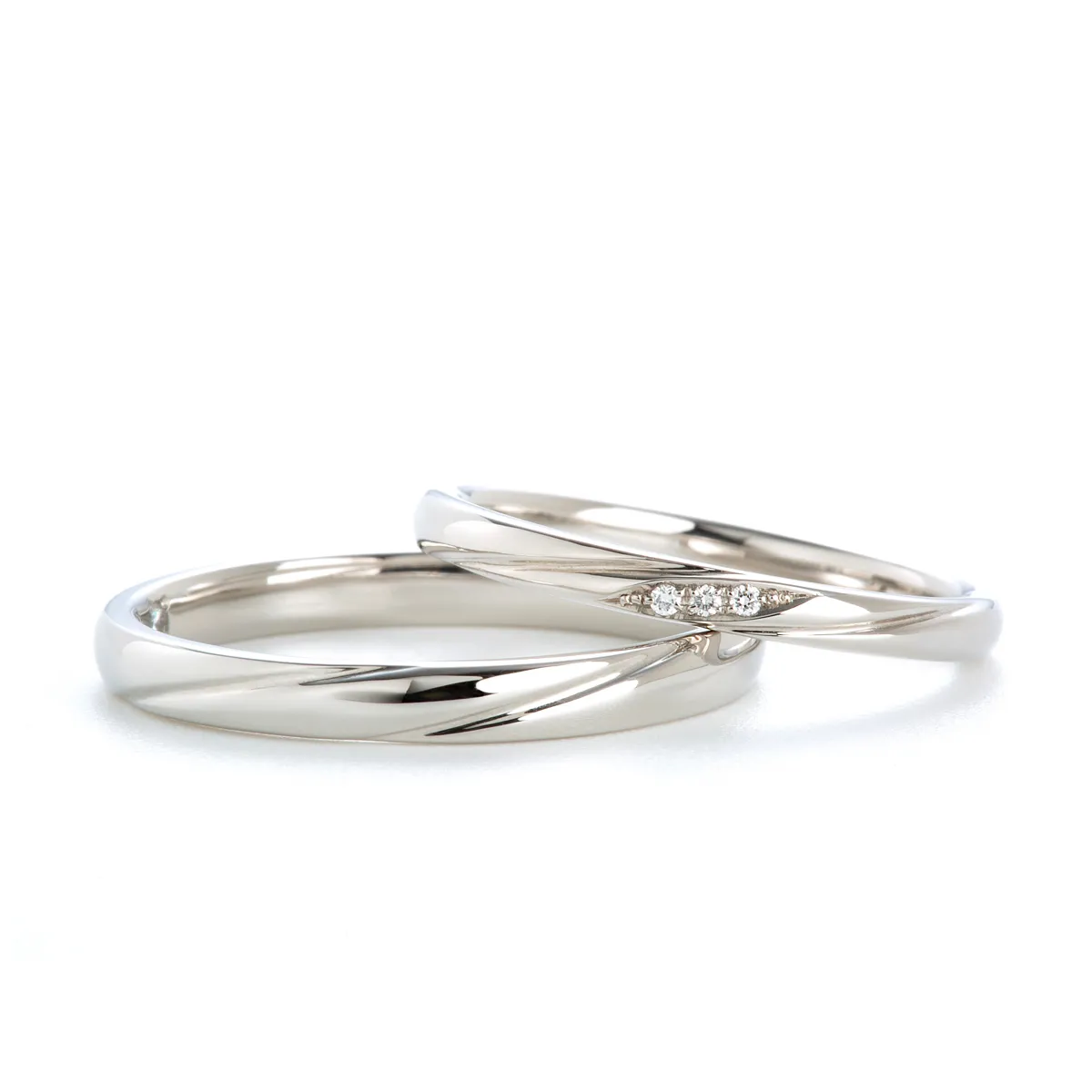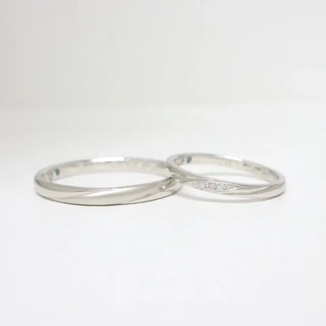 リングに刻まれた二本のラインは、ふたりが寄り添い、歩んでいく姿を重ねて。1つの原石から生まれた2粒のダイヤ「ツインズキューピッド」をセッティング。ふたりの絆の証。