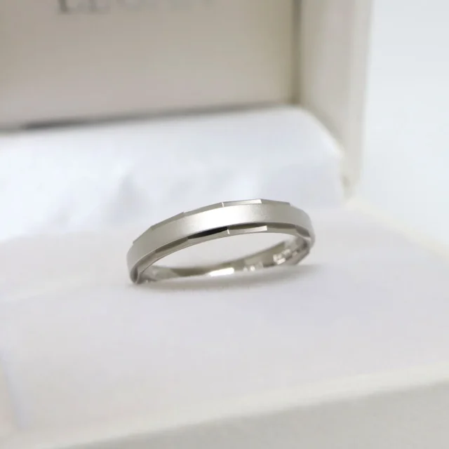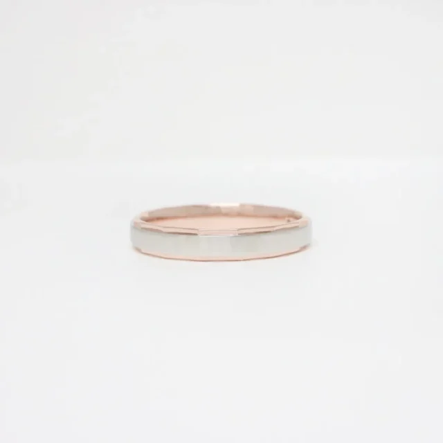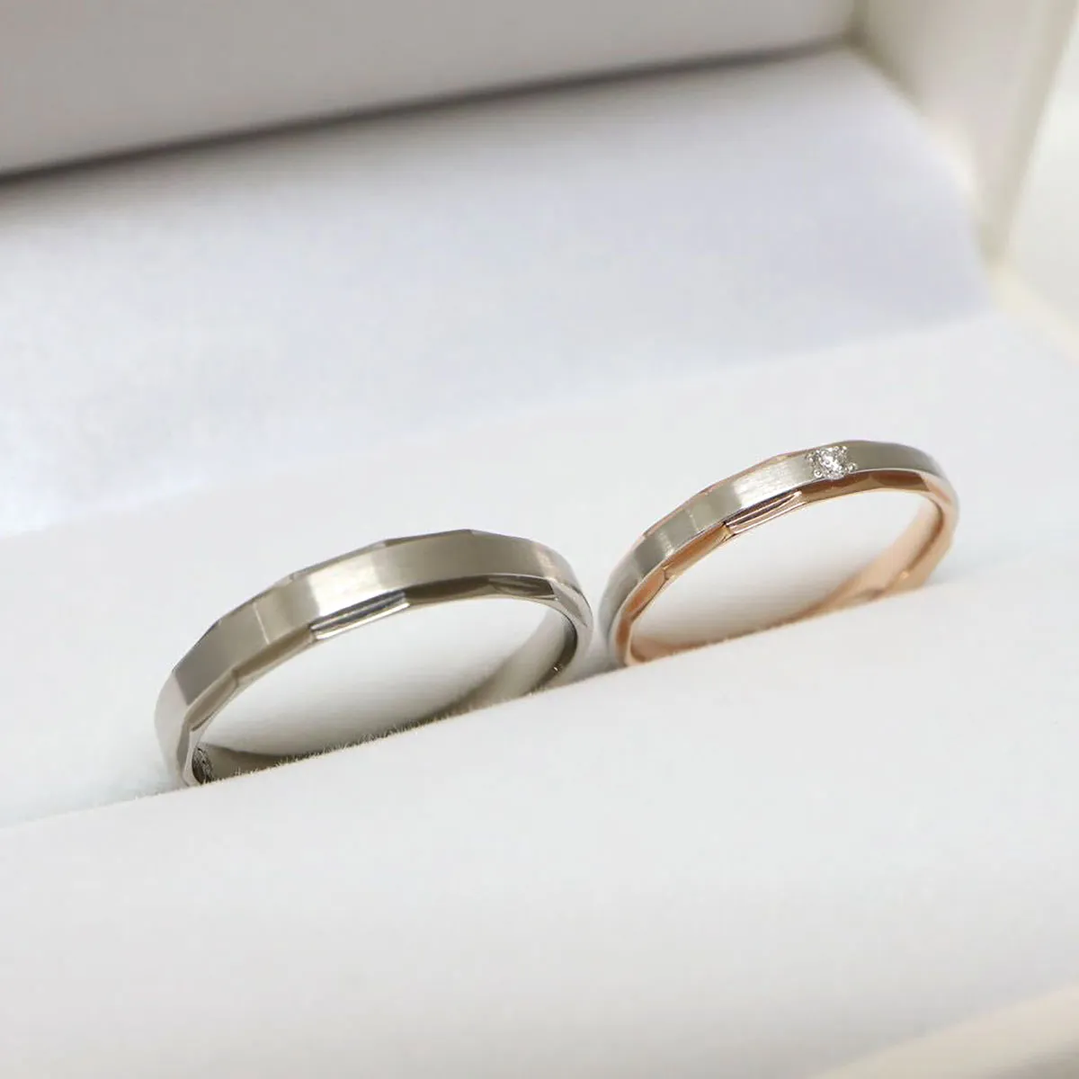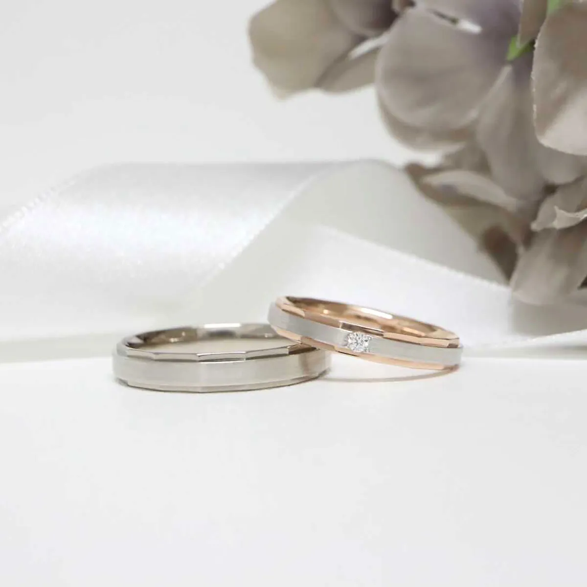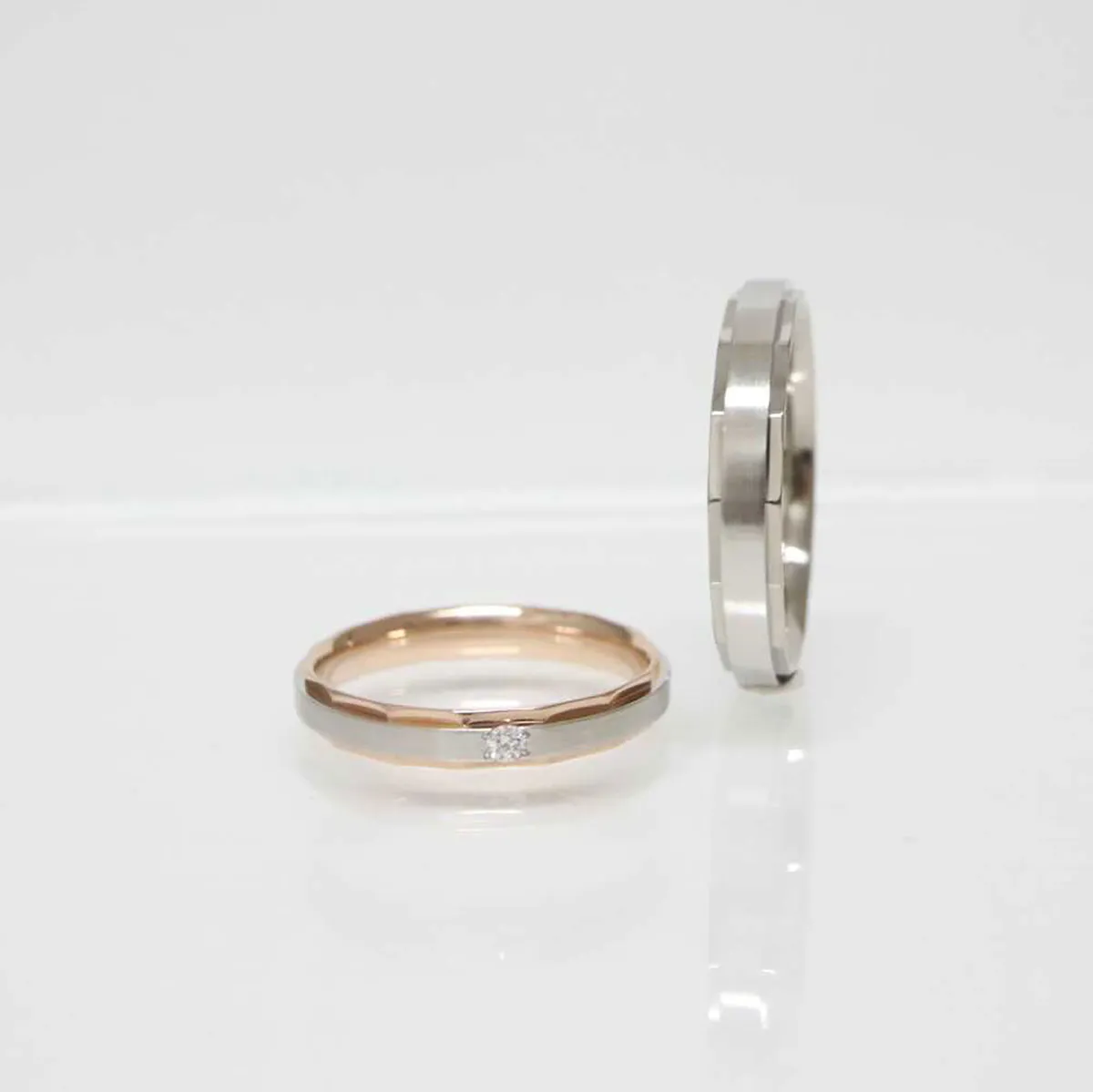 プラチナとゴールドのコンビネーションがスタイリッシュな結婚指輪。素材感を引き立たせる特殊なミラーカットのデザインで洗練された印象に。