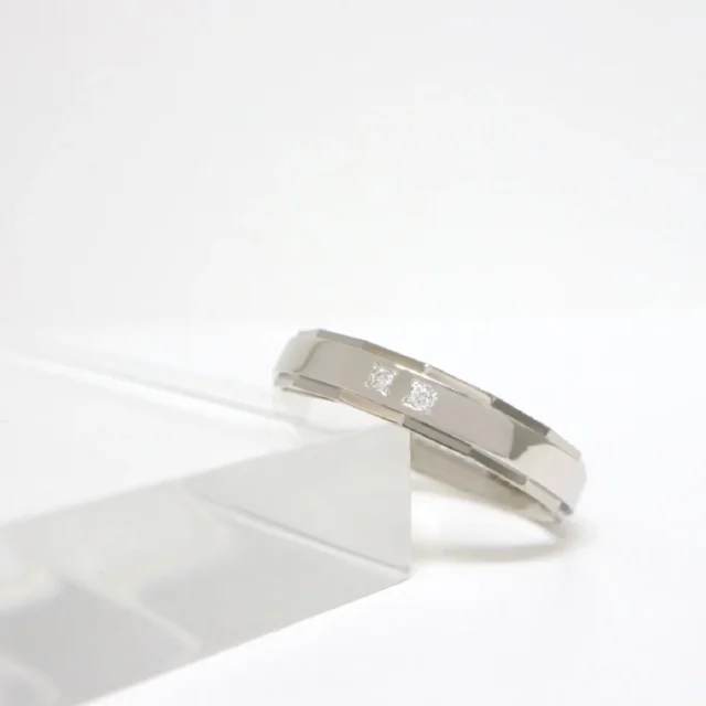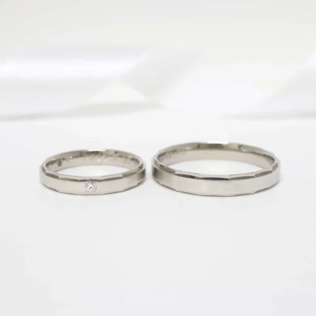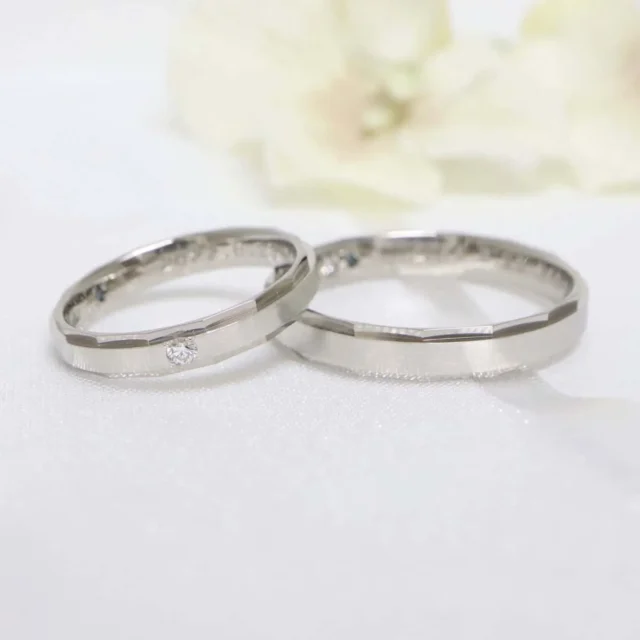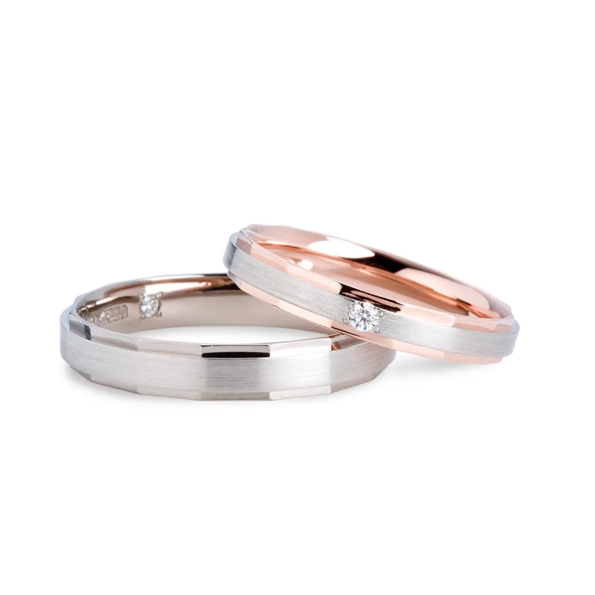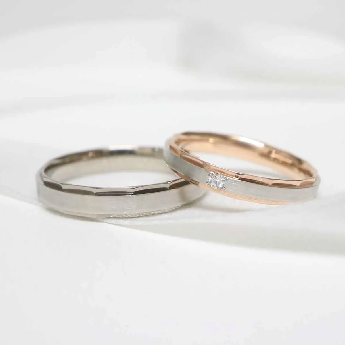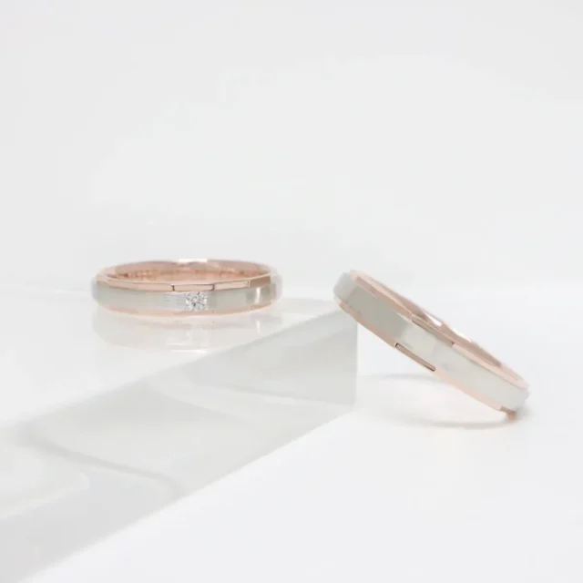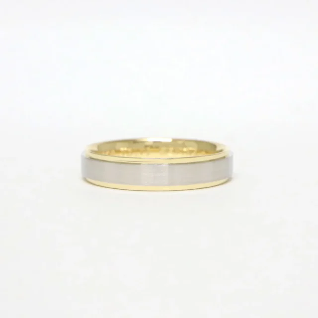 プラチナとゴールドのコンビネーションがスタイリッシュな結婚指輪。素材感を引き立たせる特殊なミラーカットのデザインで洗練された印象に。