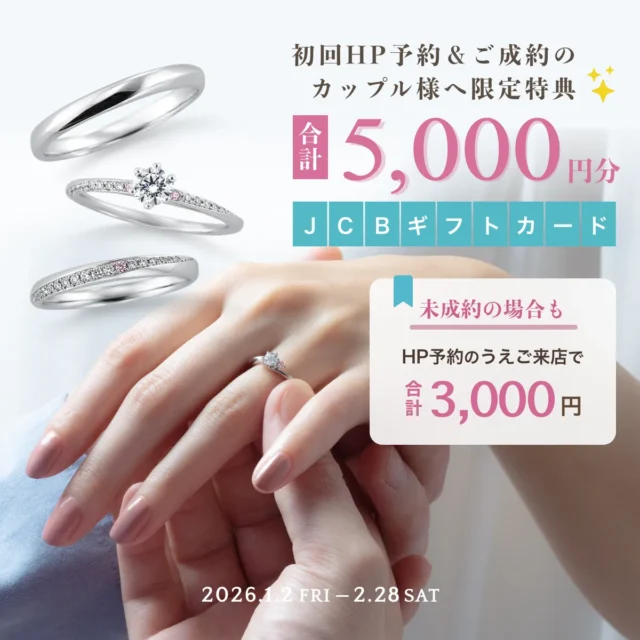 事前に来店予約のうえ、初めてご来店&ご成約頂いたカップル様に『JCBギフト券3,000円分』を贈呈いたします。