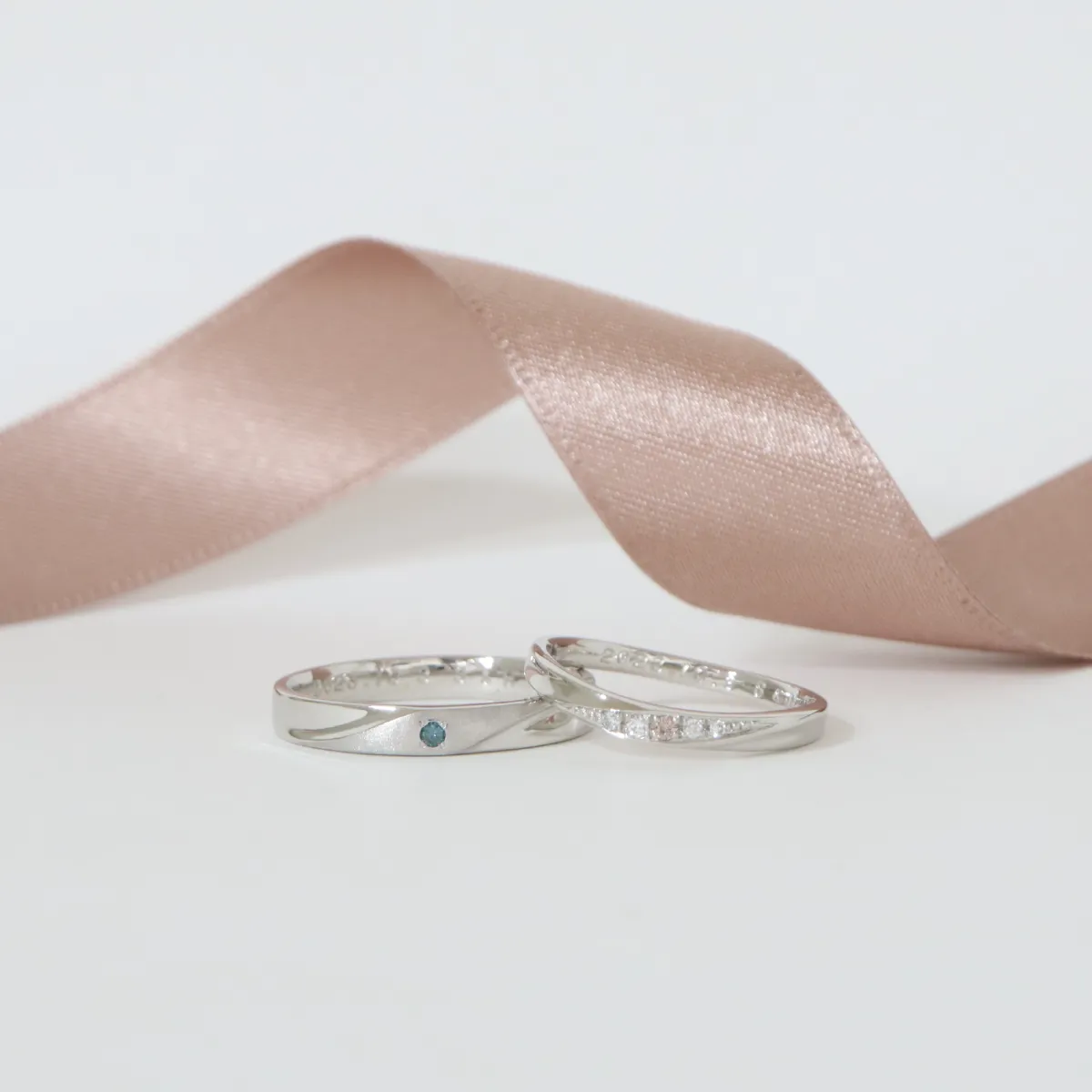 夫の真ん中に1石とふたりとも内石にブルーダイヤモンドを