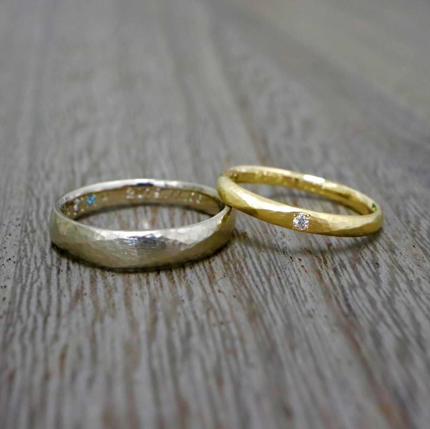 こちらの結婚指輪は表面に凹凸のある槌目加工につや消しのヘアライン仕上げを施しています 。