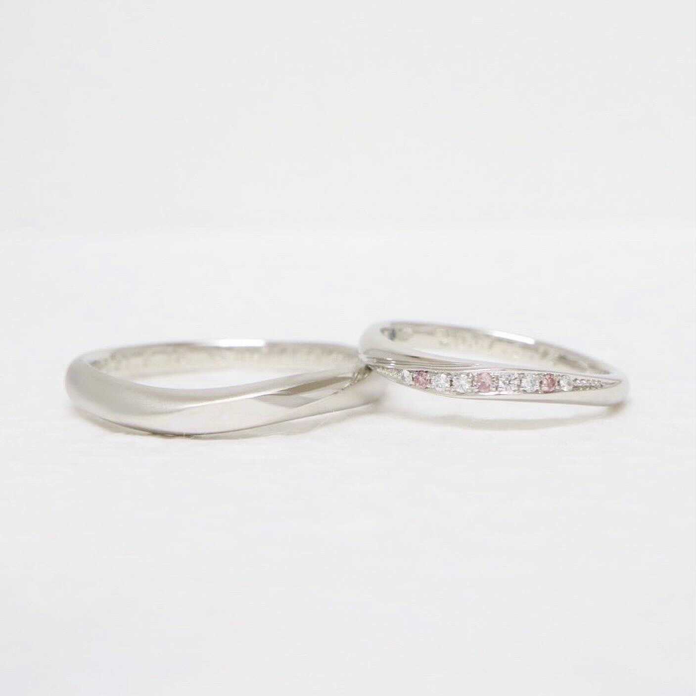 おふたりはウェーブラインでリングの形を合わせ別モデルでお選びに 。