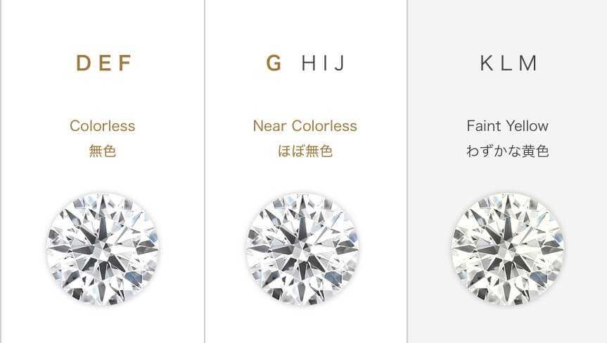 カラーはダイヤモンドの色合いを評価します。自然界のダイヤモンドの多くは黄色や茶色を帯びています。そのため「無色(Dカラー)」に近いダイヤモンドほど希少性が高まります。評価は完全無色のDカラーから、以降Zカラーまでグレードがあります。今回のダイヤモンドは最高ランクのDカラーのみ厳選しました。