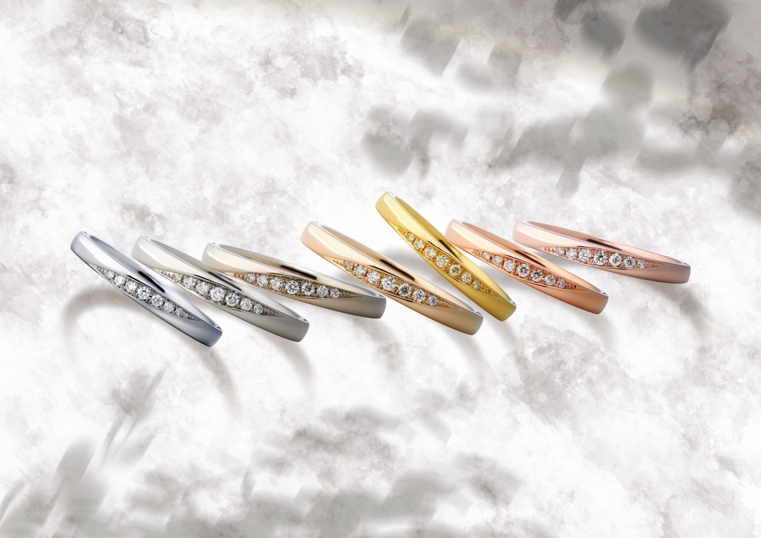 銅と銀・パラジウムを配合し、ピンクゴールドに比べて少し明るめな「アイスピンクゴールド」。パラジウムを配合することにより、酸化しづらく変色に強い特徴があります。肌なじみがよく女性に人気な素材で、メレダイヤの輝きが映える素材です。