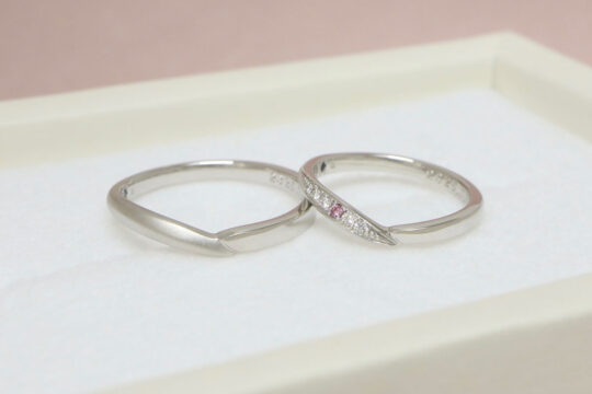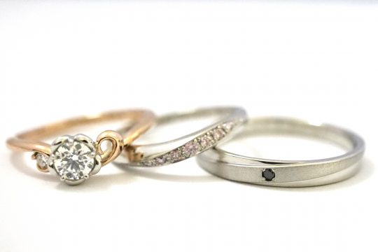 ピンクダイヤがとても可愛いです。 結婚指輪は、婚約指輪と重ねづけができるデザインを、いくつかあげて...